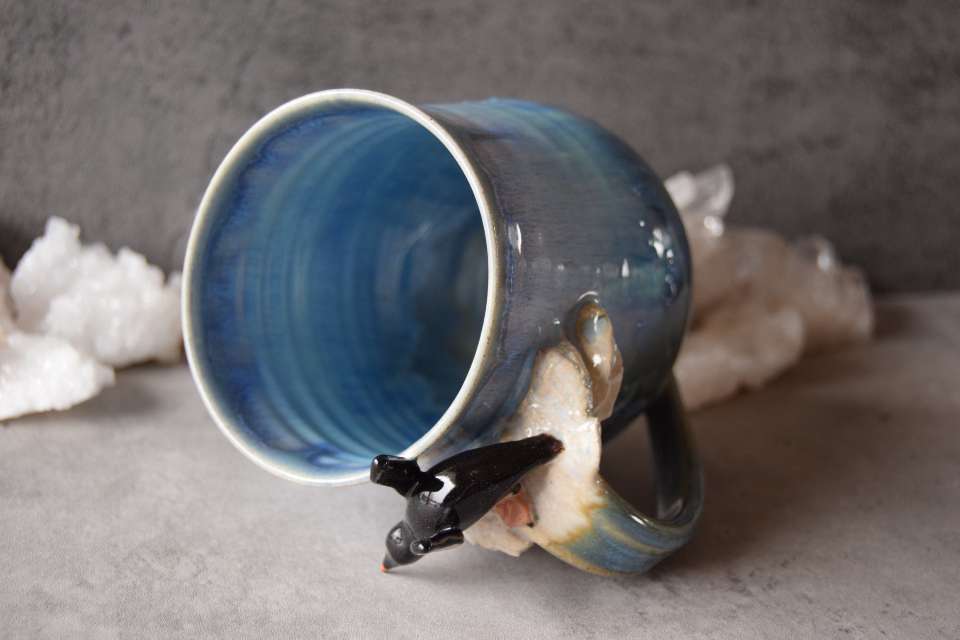 Handmade mug featuring hand sculpted adelie penguin. Approximately 18 oz