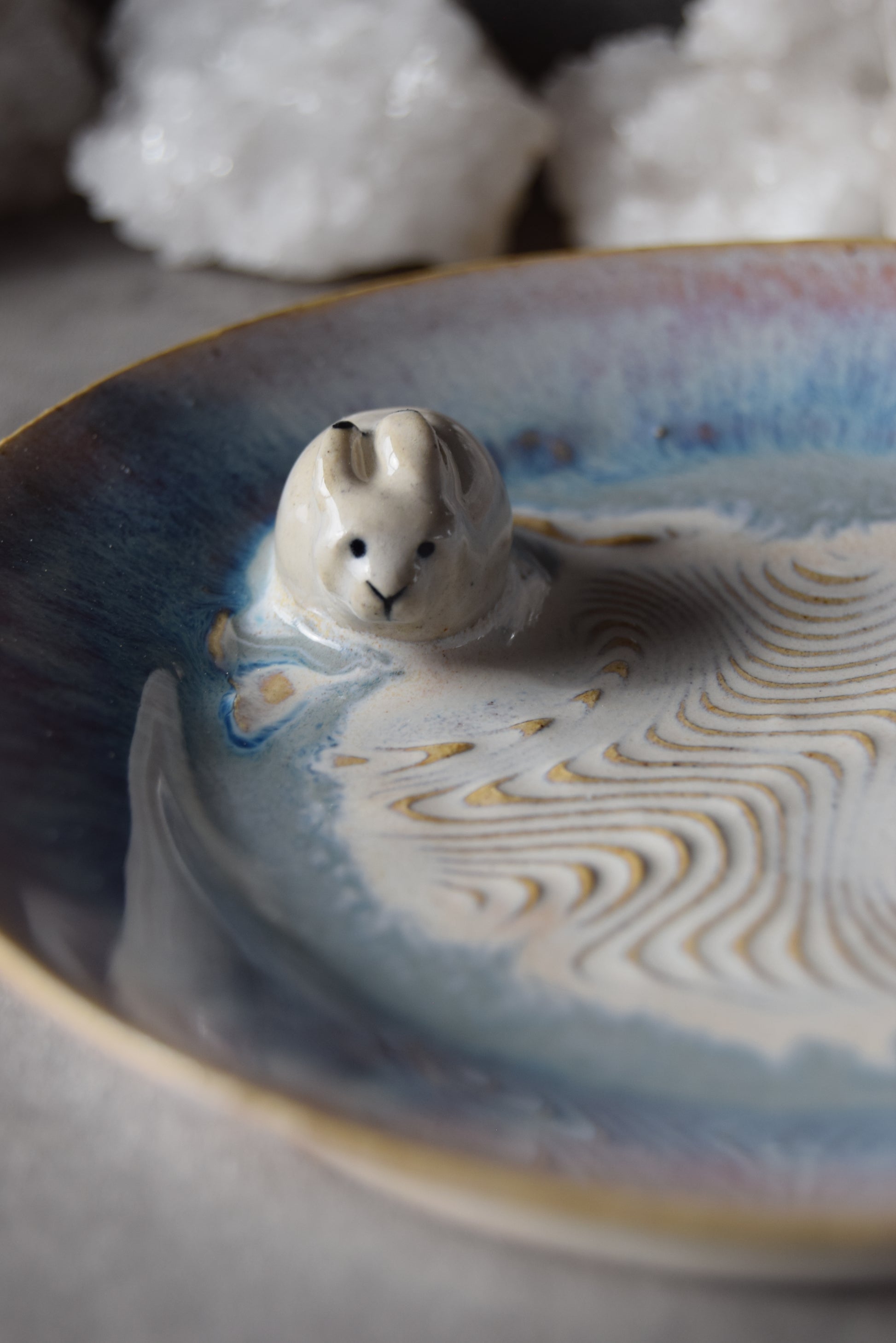 Handmade trinket plate featuring hand sculpted arctic hare. Plate measures approximately 5.5" diameter and .75" depth at plate's edge.