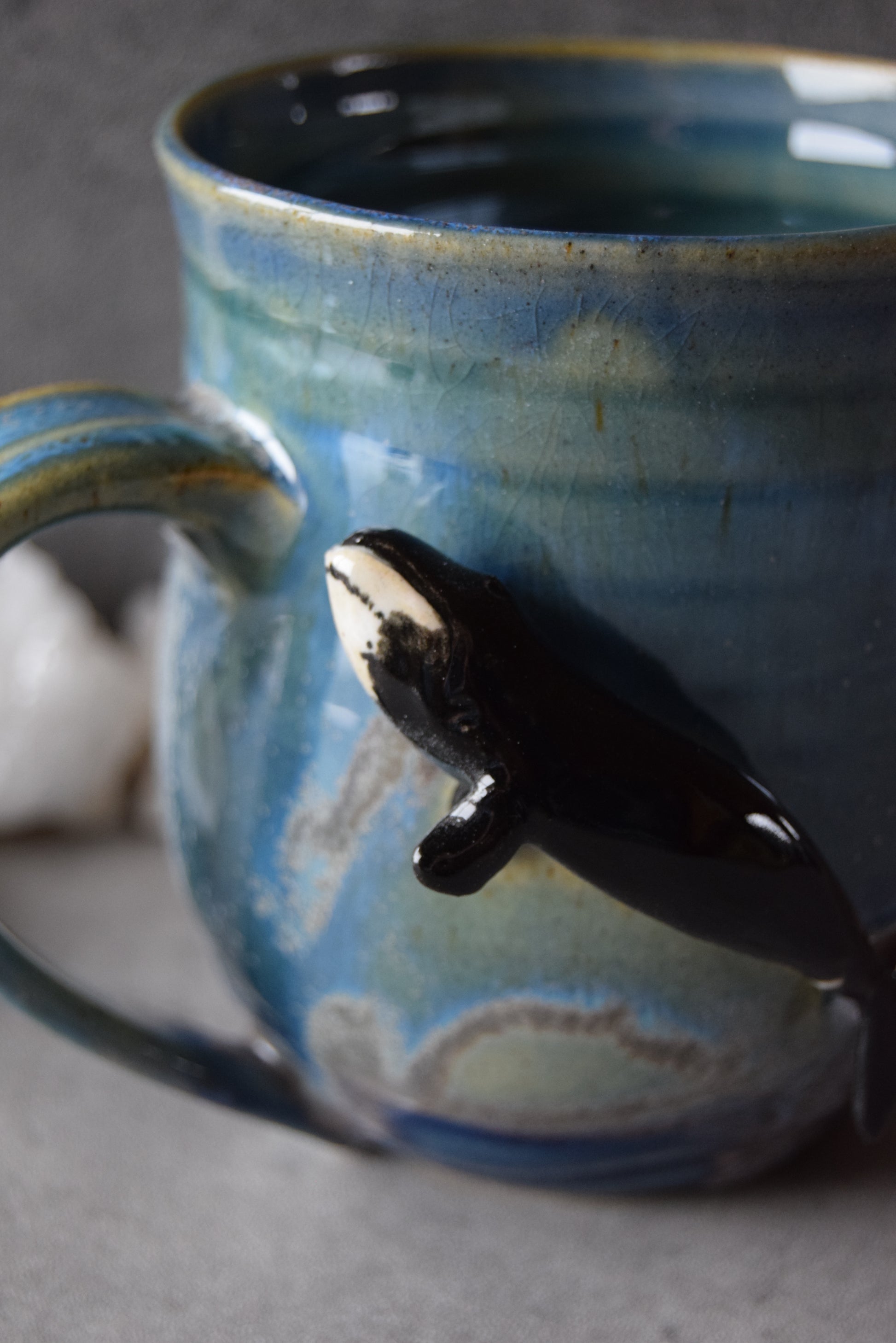Handmade mug featuring hand sculpted bowhead whale. Approximately 14 oz