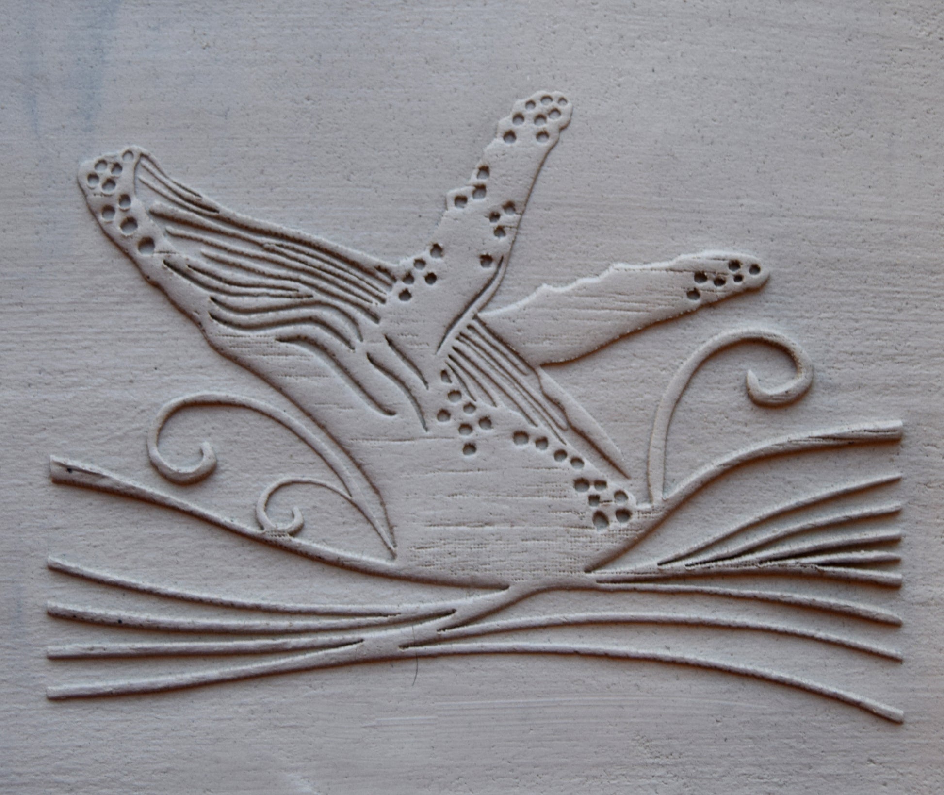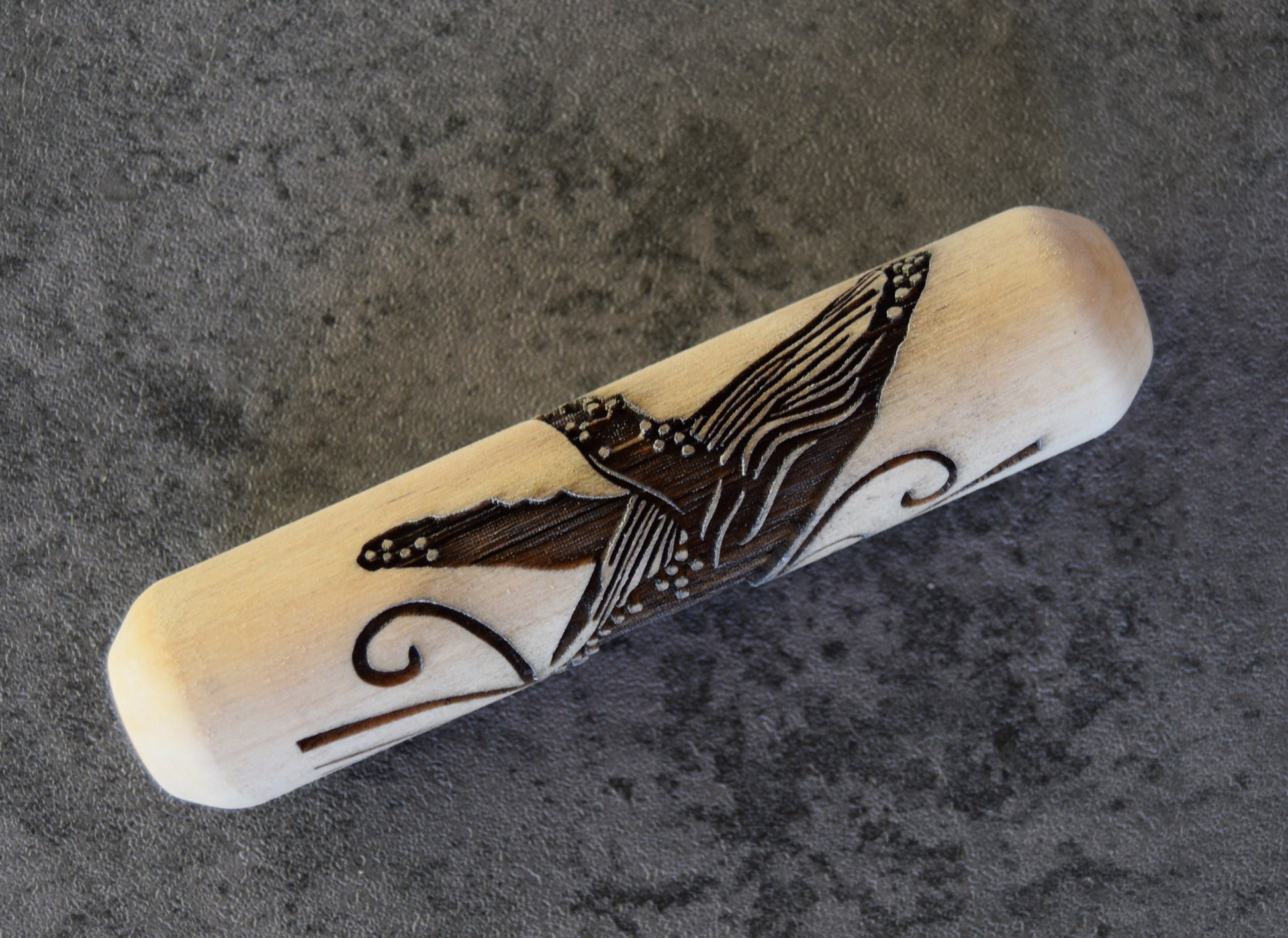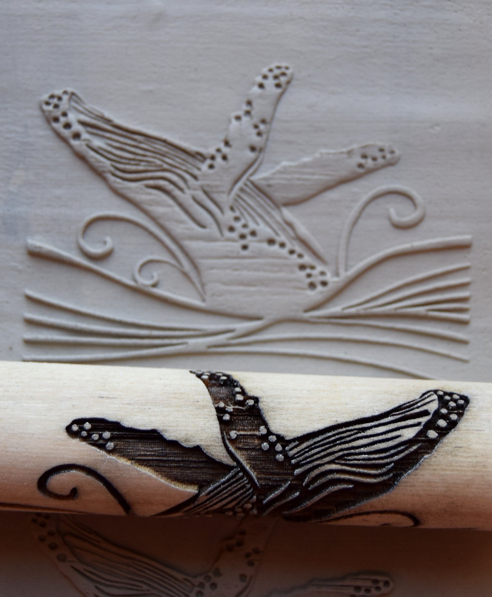 Handmade texture roller featuring laser engraved breaching humpback whale pattern. Designed for imprinting clay or other similar materials, this roller is made of poplar wood and sealed with protective oil to preserve working quality of the wood. Roller is beveled and sanded smooth on each end for seamlessly integrating with other designs.