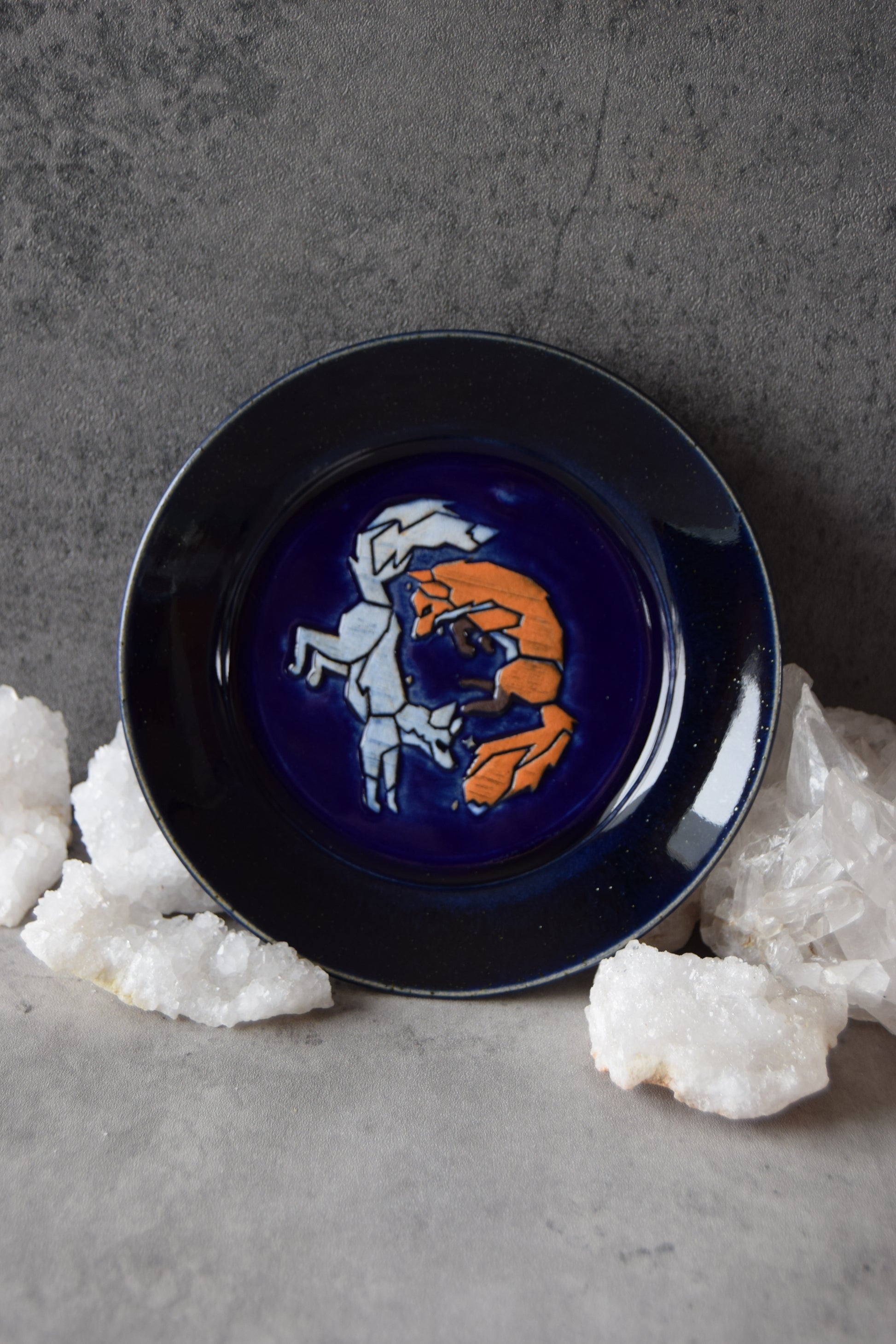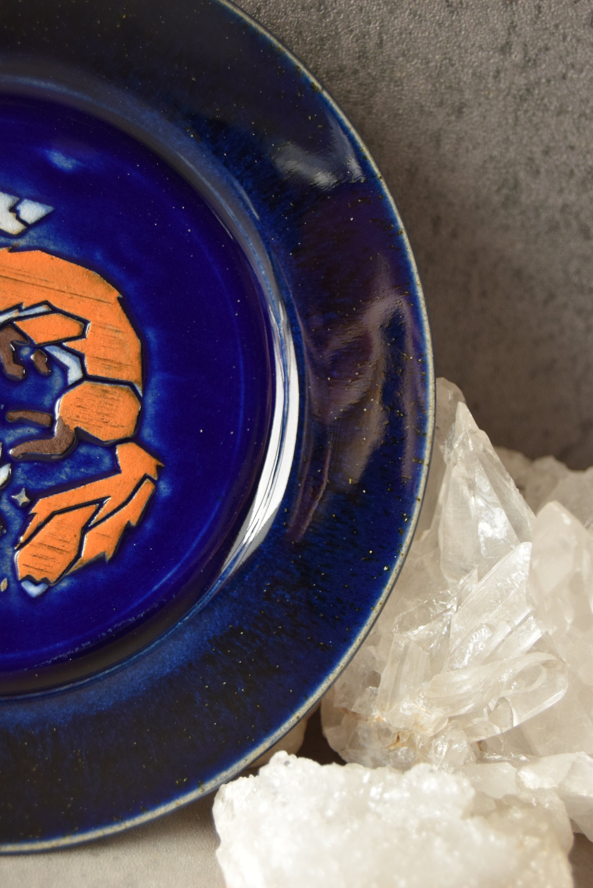 Handmade ceramic plate made in collaboration with Joelle Cook. Plate features original drawing by Joelle embossed into the clay and then hand painted and glazed by Kelsey. Plate measures approximately 5.25" diameter and .75" depth.