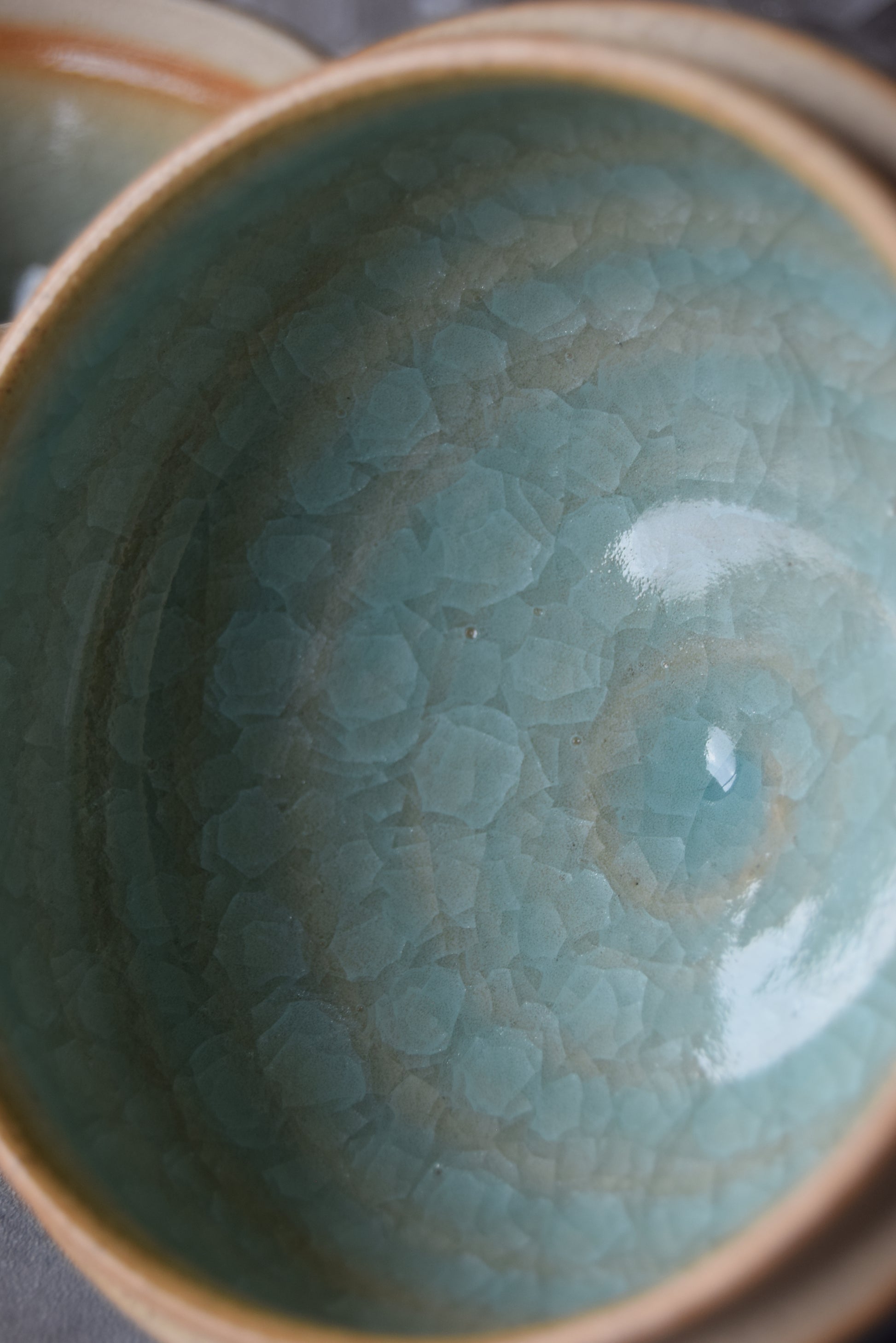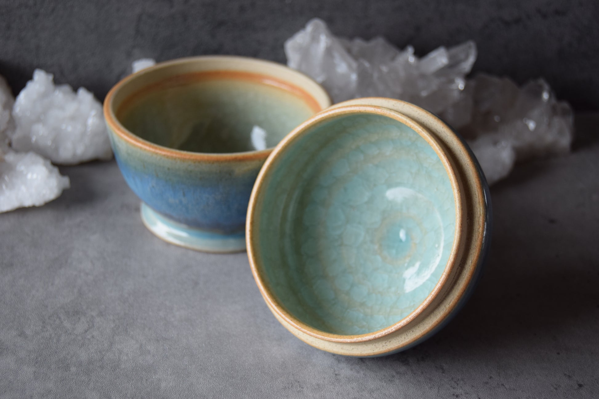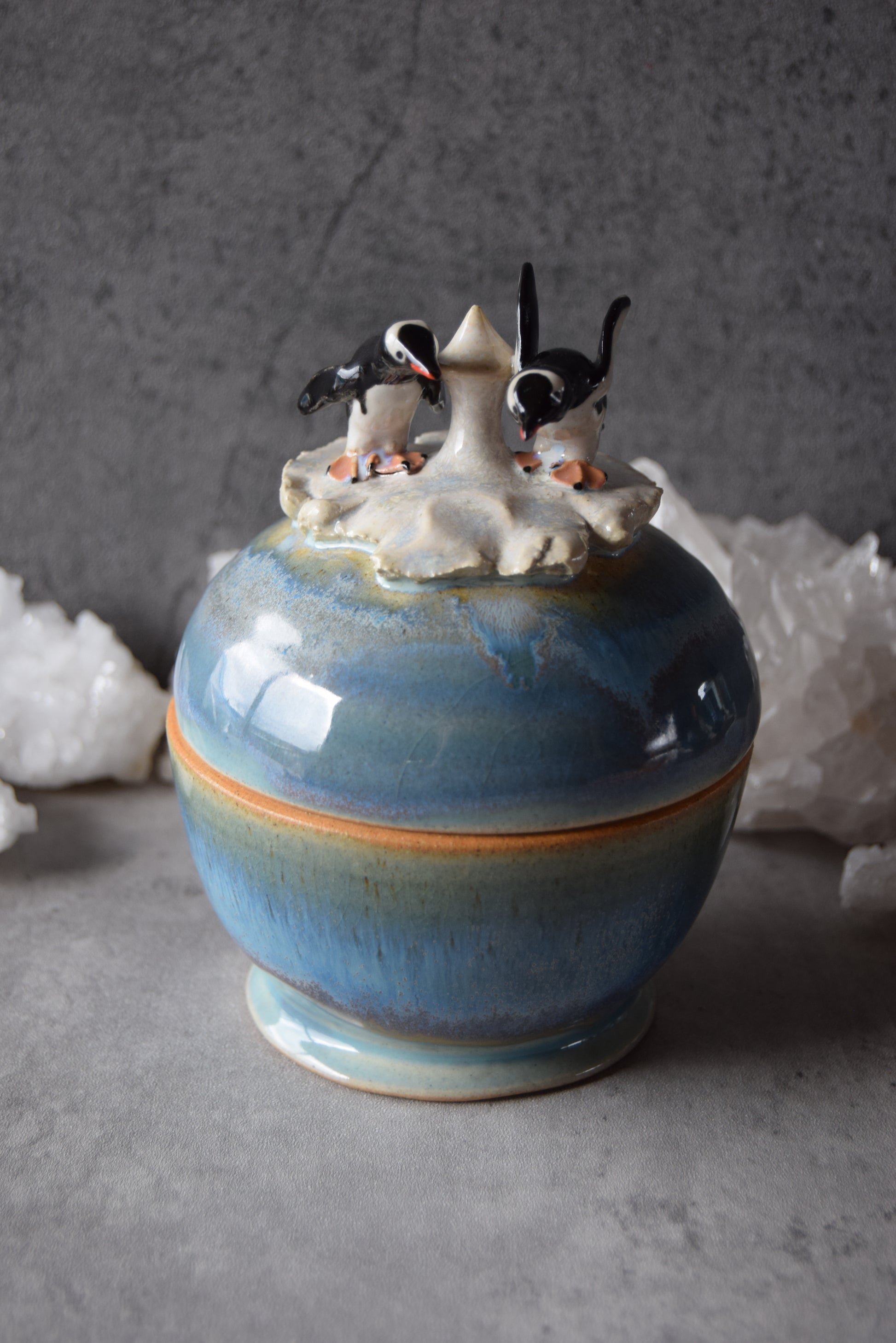 Handmade lidded jar featuring hand sculpted pair of Gentoo penguins with a stunning icy layered crackle glaze on the interior. Jar measures approximately 5.5" height and 3.75" diameter.
