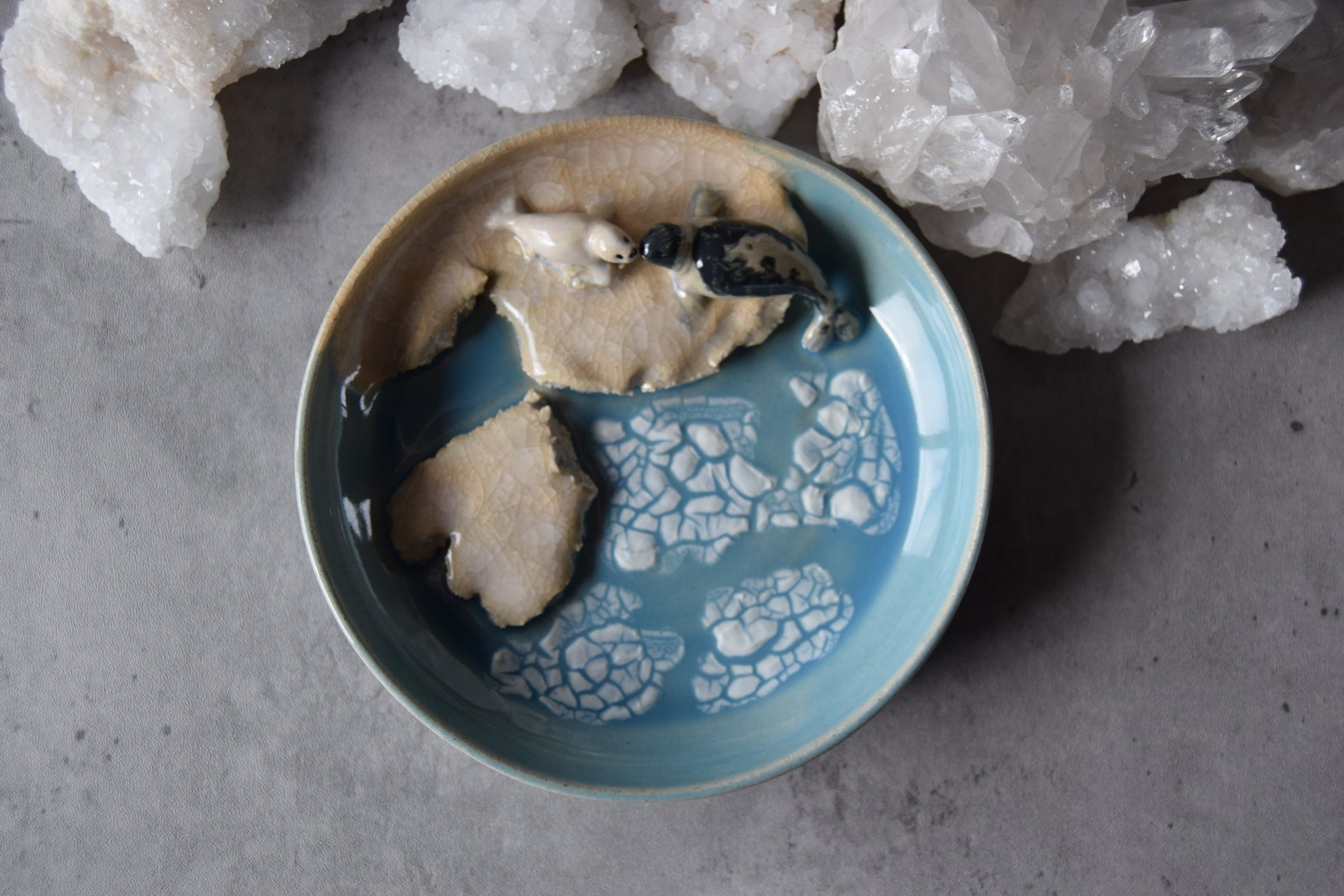 Handmade trinket plate featuring hand sculpted harp seals. Plate measures approximately 5.75" diameter and 1" depth at plate's edge.