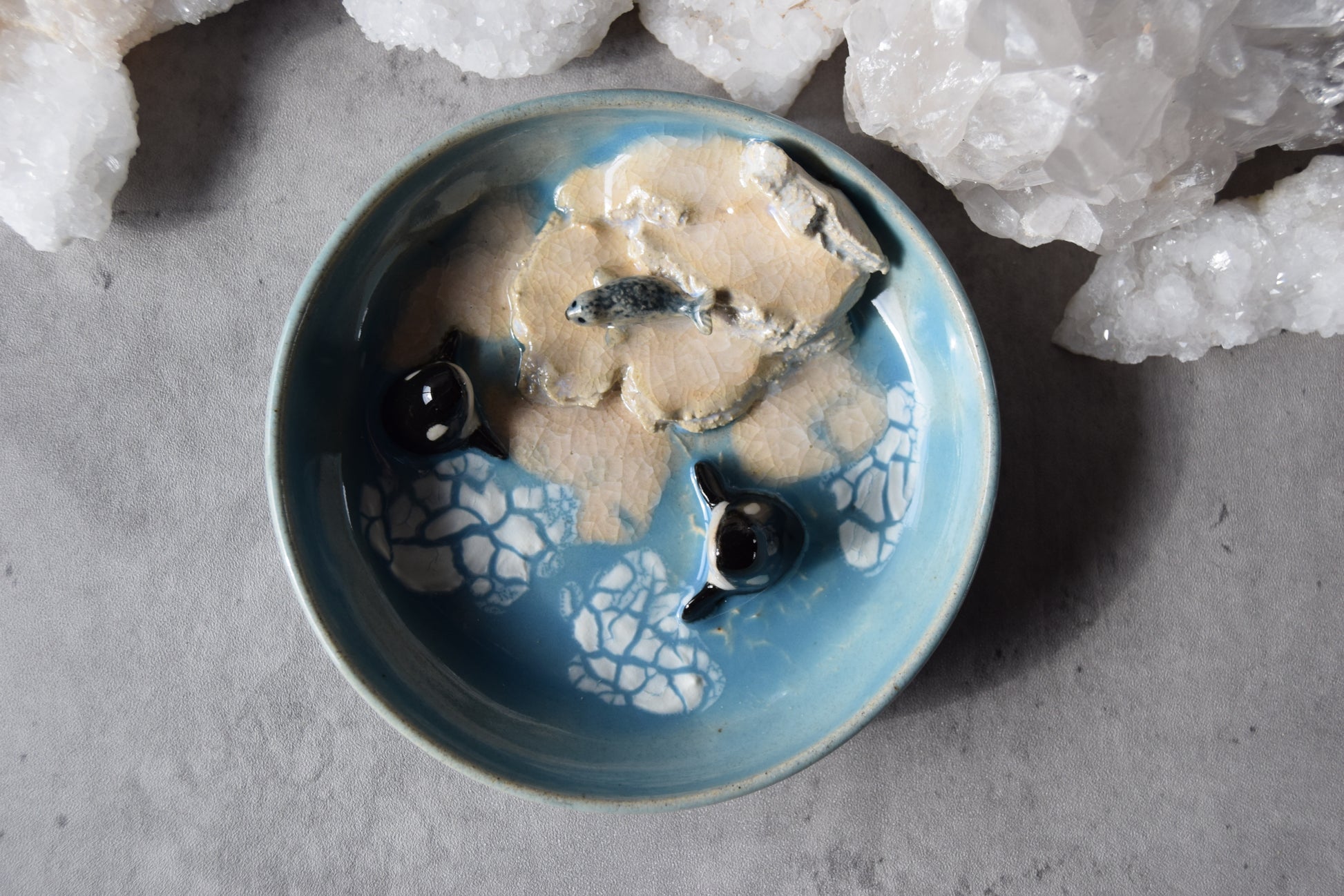 Handmade trinket plate featuring hand sculpted orcas. Plate measures approximately 5" diameter and 1" depth at plate's edge.