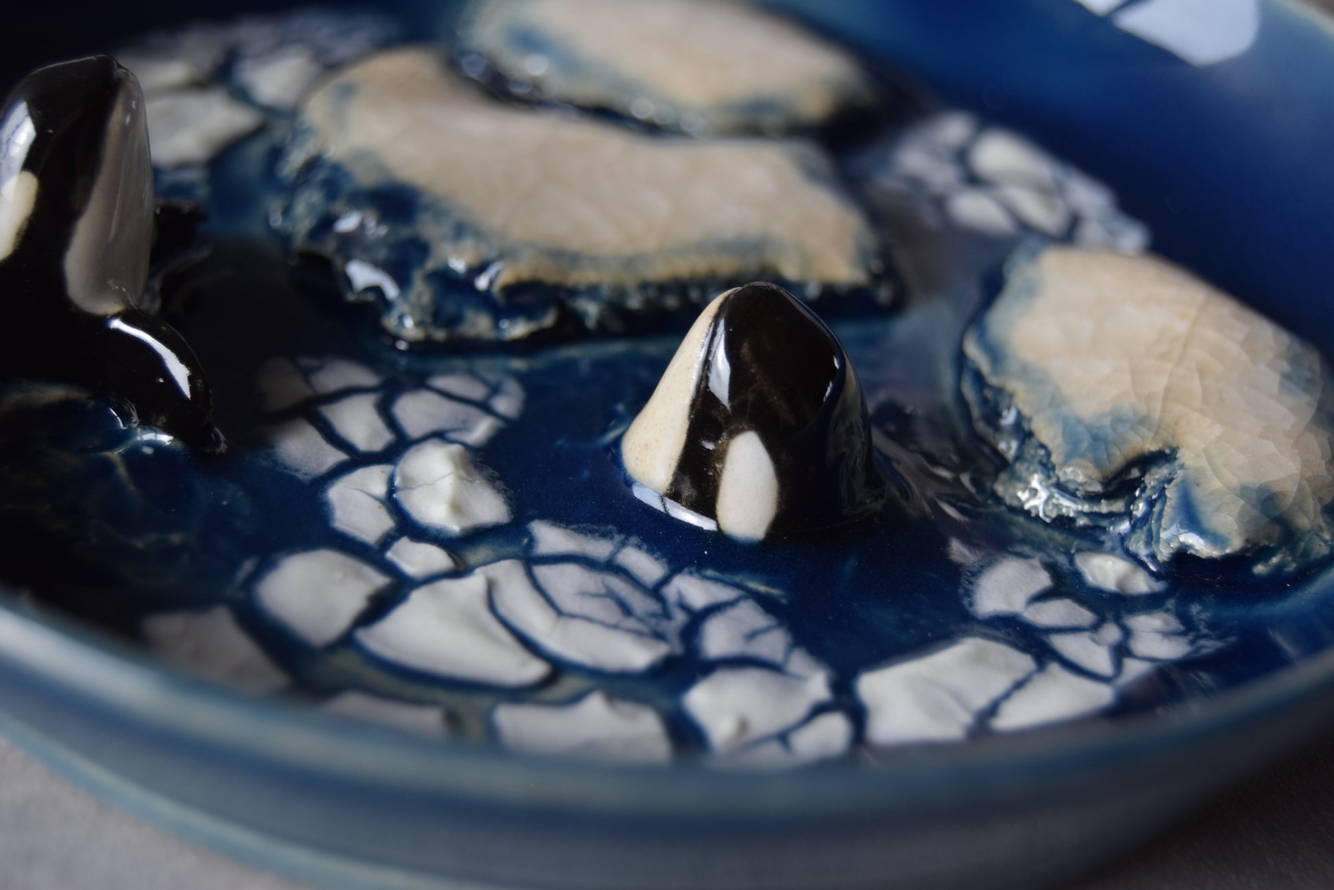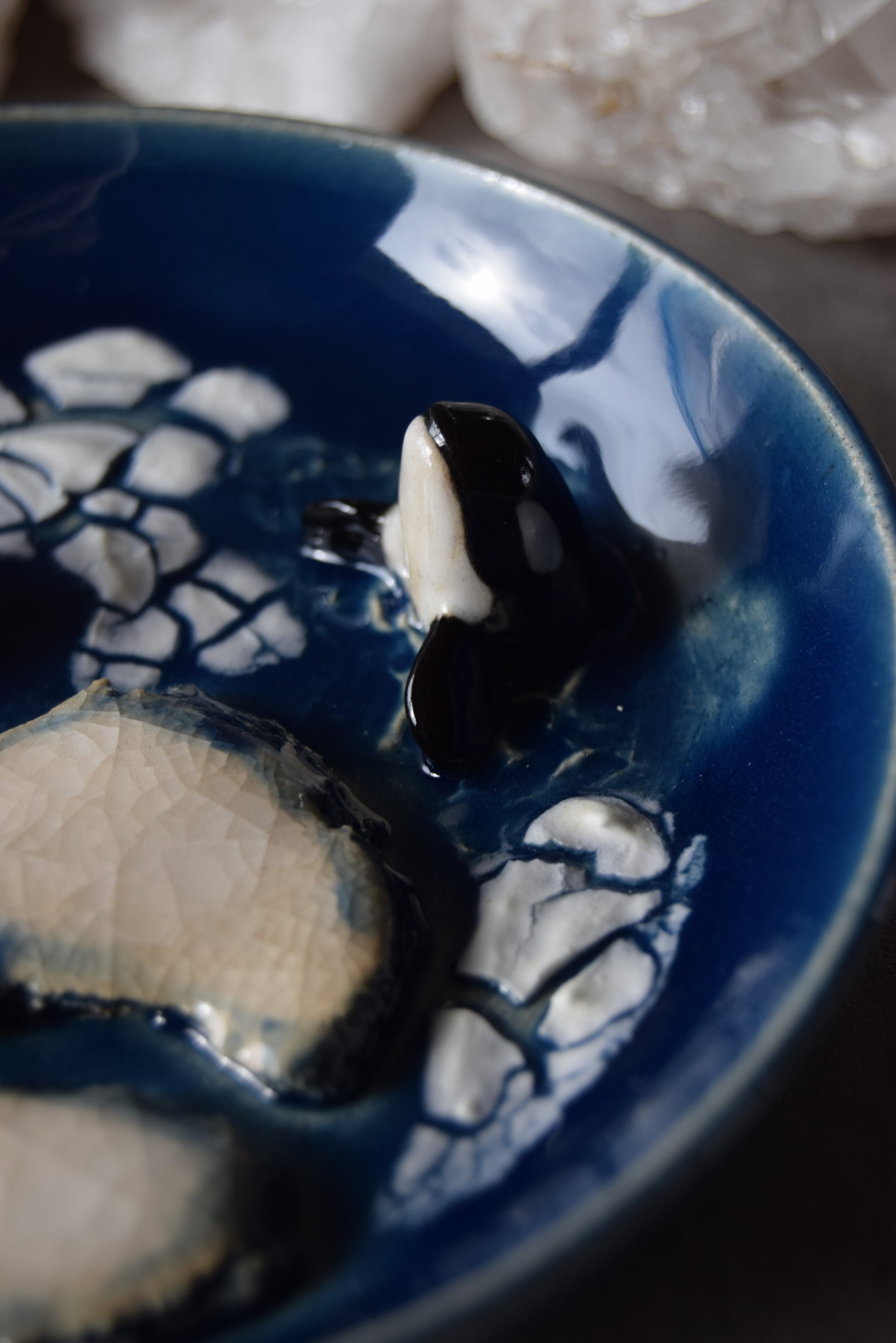 Handmade trinket plate featuring hand sculpted orcas. Plate measures approximately 5" diameter and .75" depth at plate's edge.