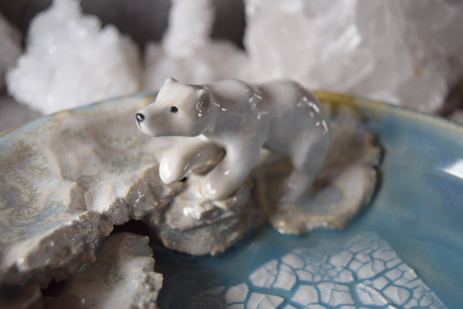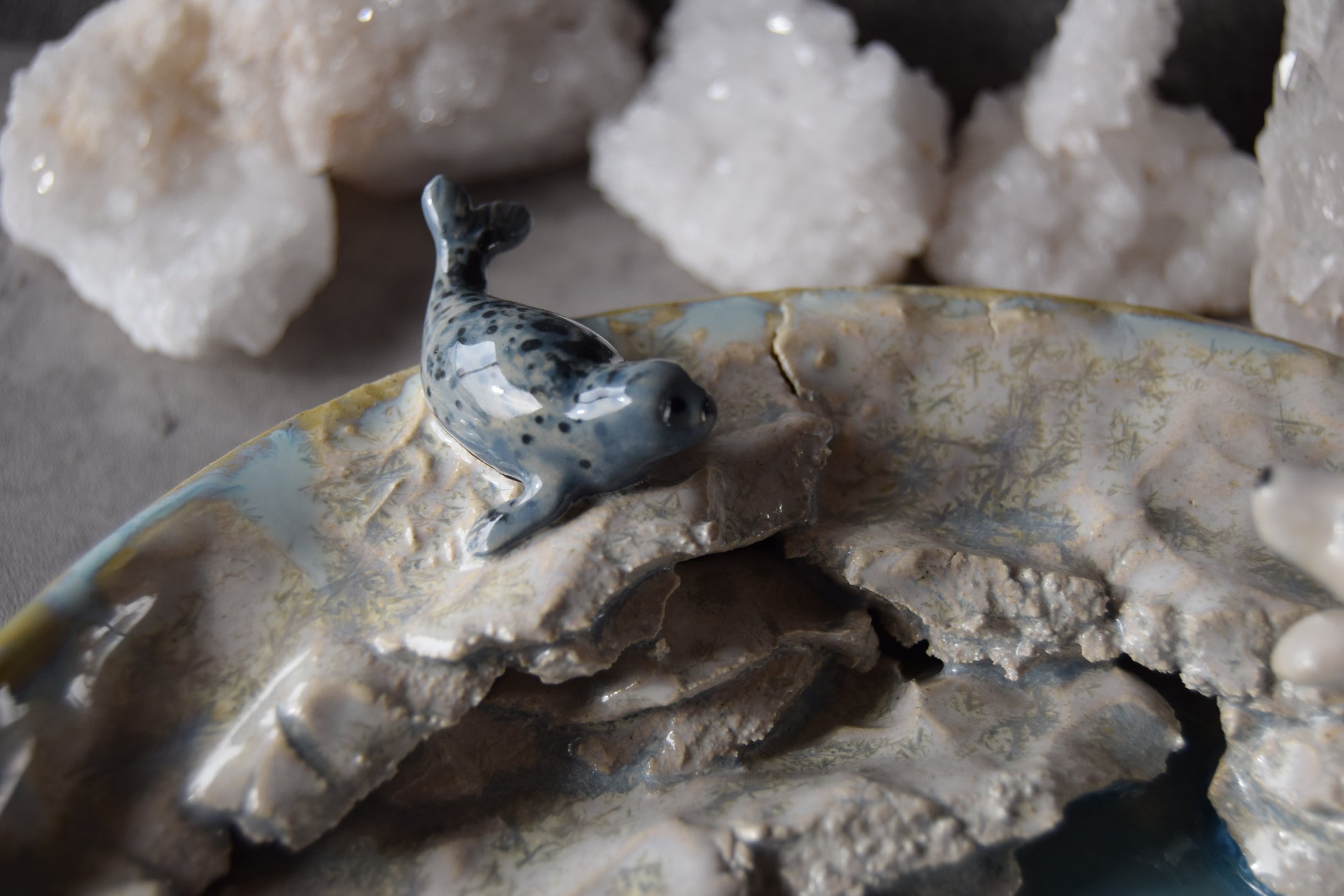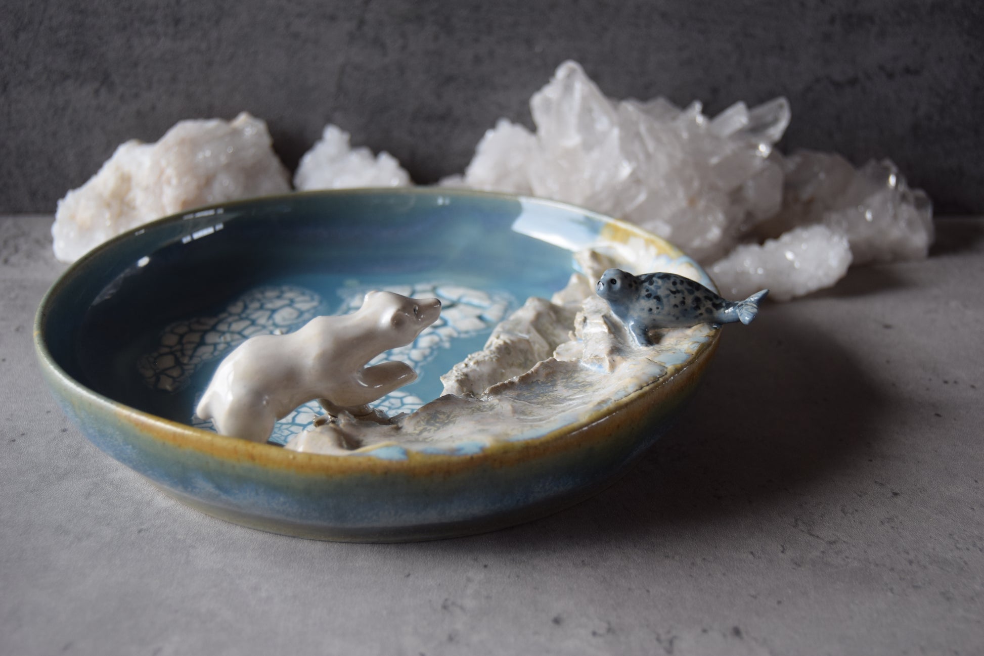 Handmade plate featuring hand sculpted Weddell seal and polar bear scene. Plate measures approximately 7.75" diameter and 1.5" deep at plate's edge.