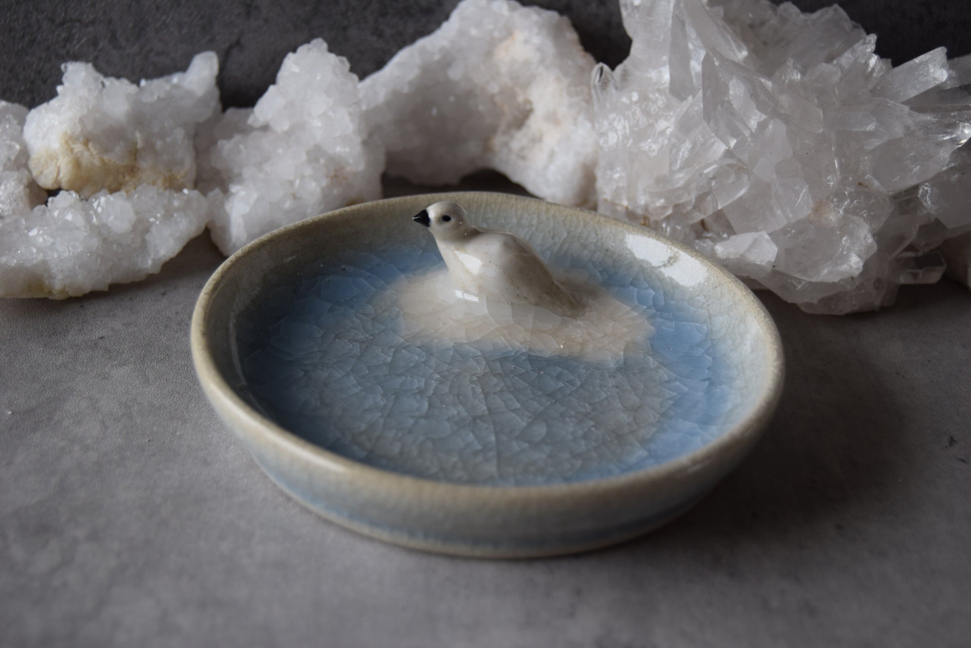 Handmade trinket plate featuring hand sculpted ptarmigan and icy layers crackle glaze. Plate measures approximately 5" diameter and .75" depth at plate's edge.