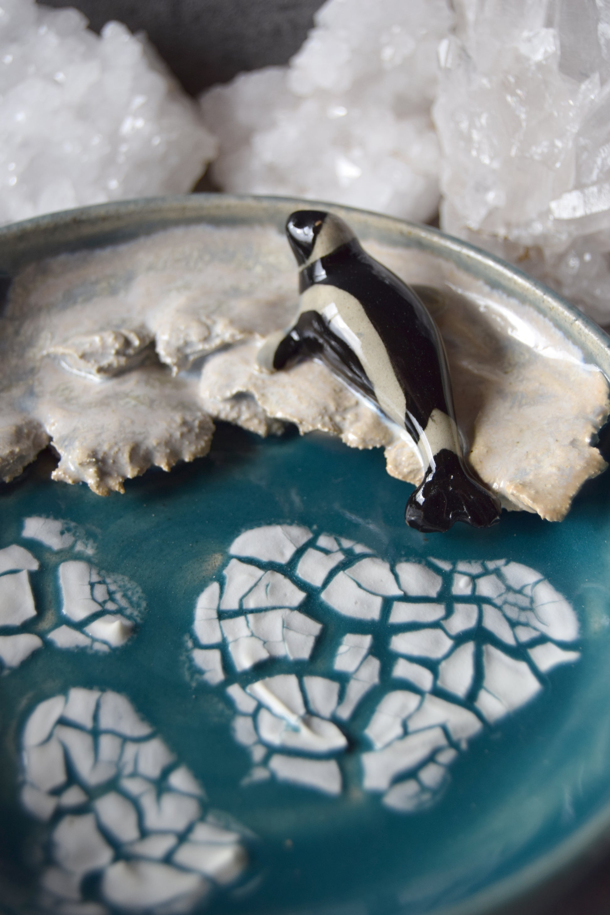 Handmade trinket plate featuring hand sculpted ribbon seal. Plate measures approximately 5.25" diameter and 1" depth at plate's edge.