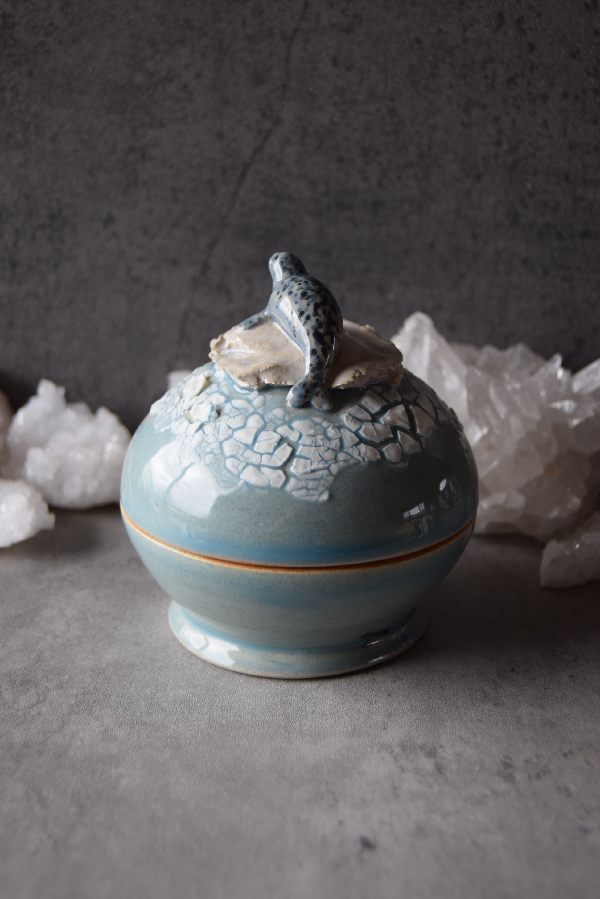 Handmade lidded jar featuring hand sculpted Weddell seal on top and orcas inside. Jar measures approximately 4.25" height and 4" diameter.