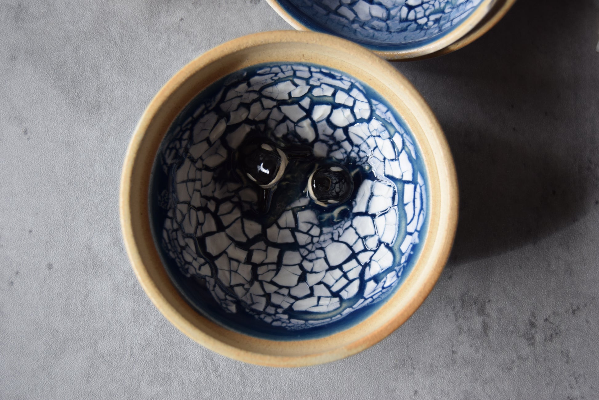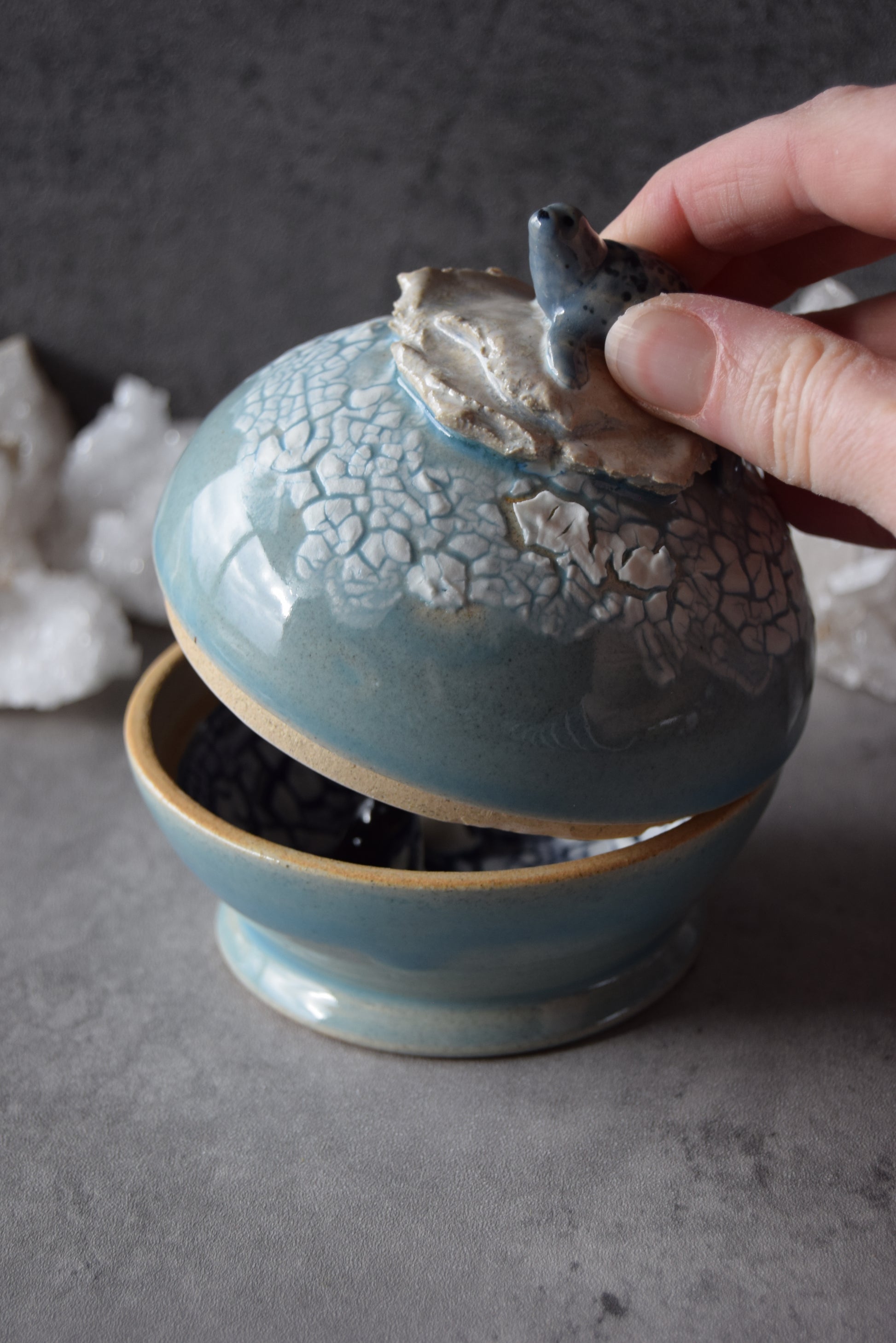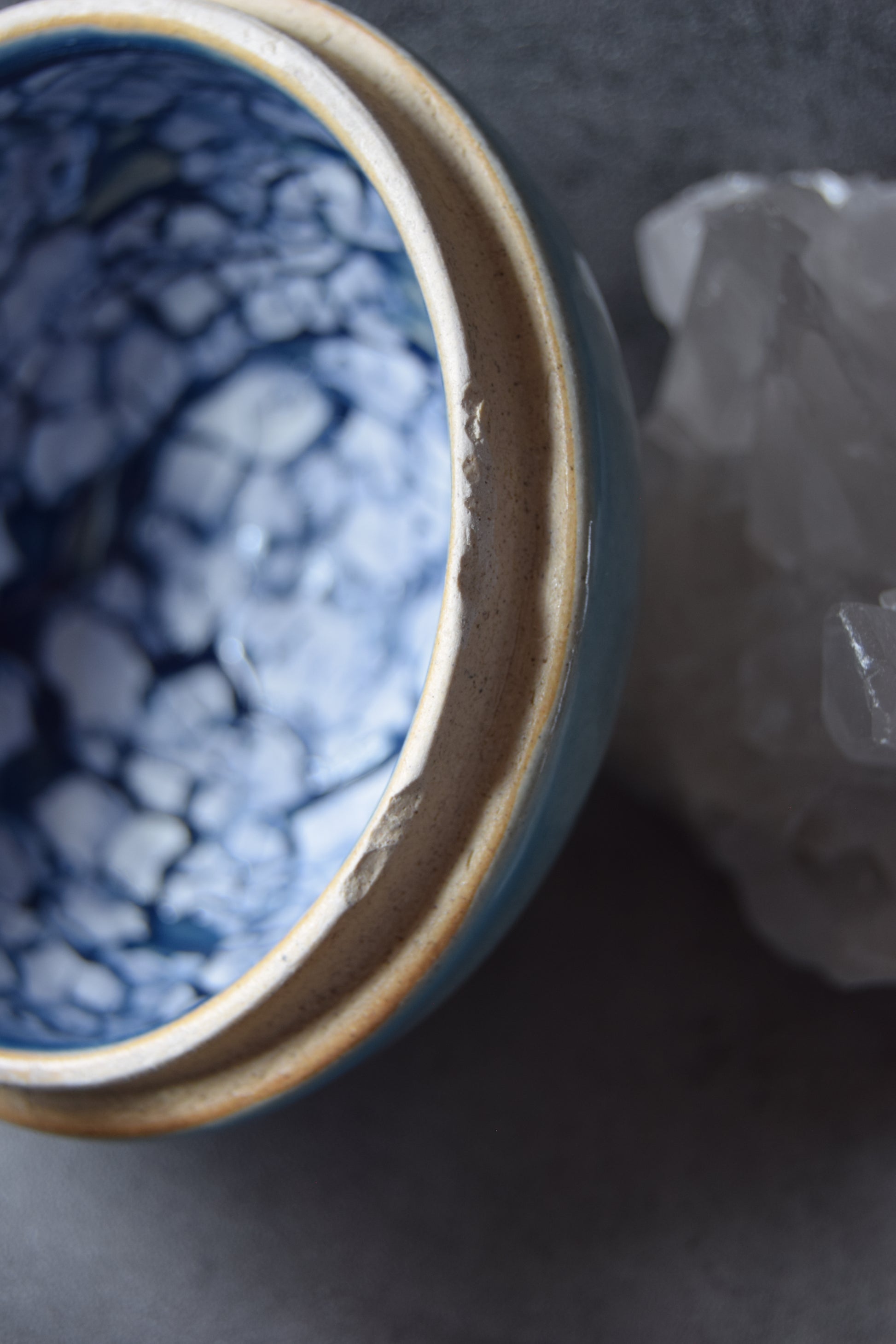 This jar is marked as "seconds" due to some small chips on the inner flange of the lid (see detail photos). They have been sanded smooth and are purely cosmetic.