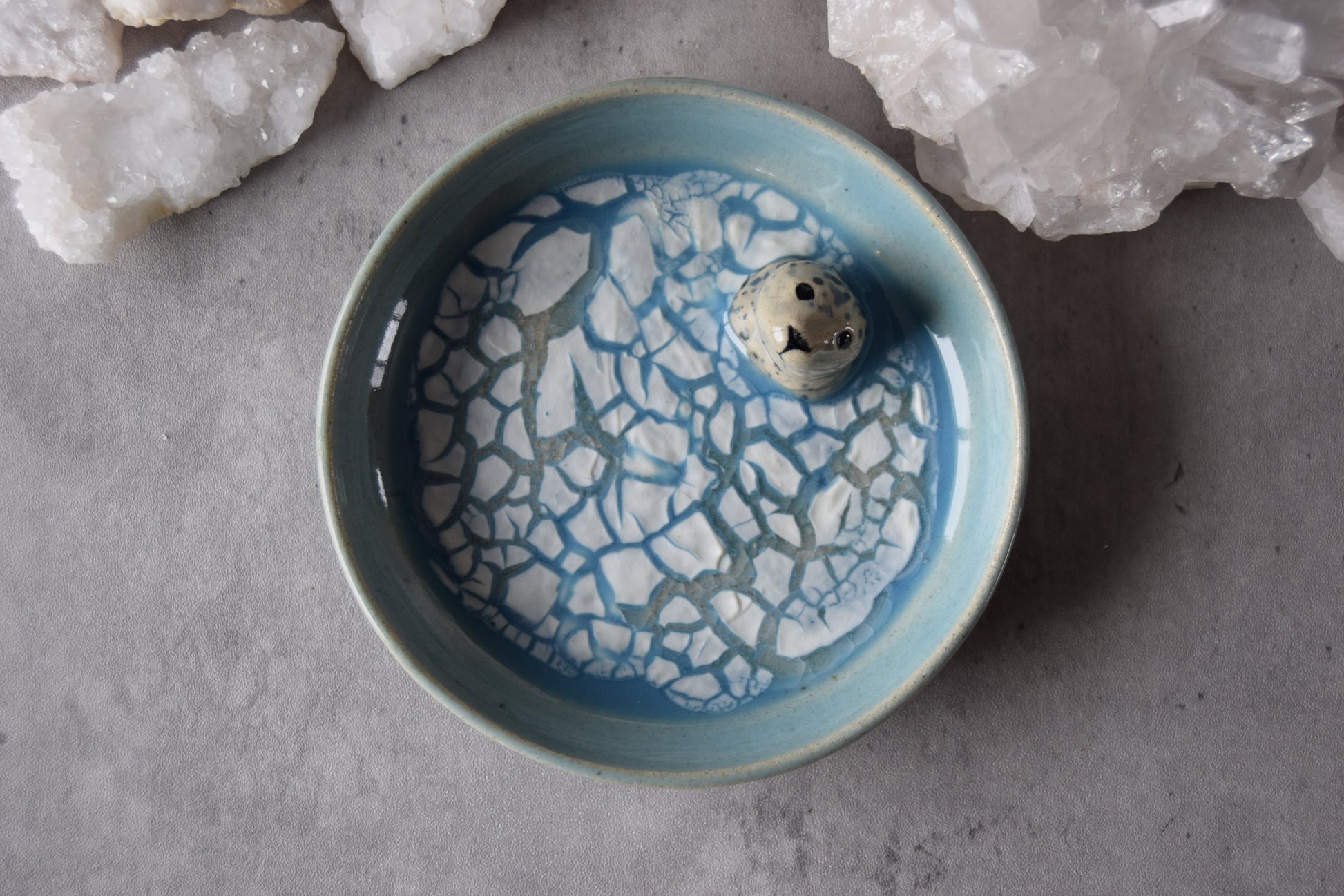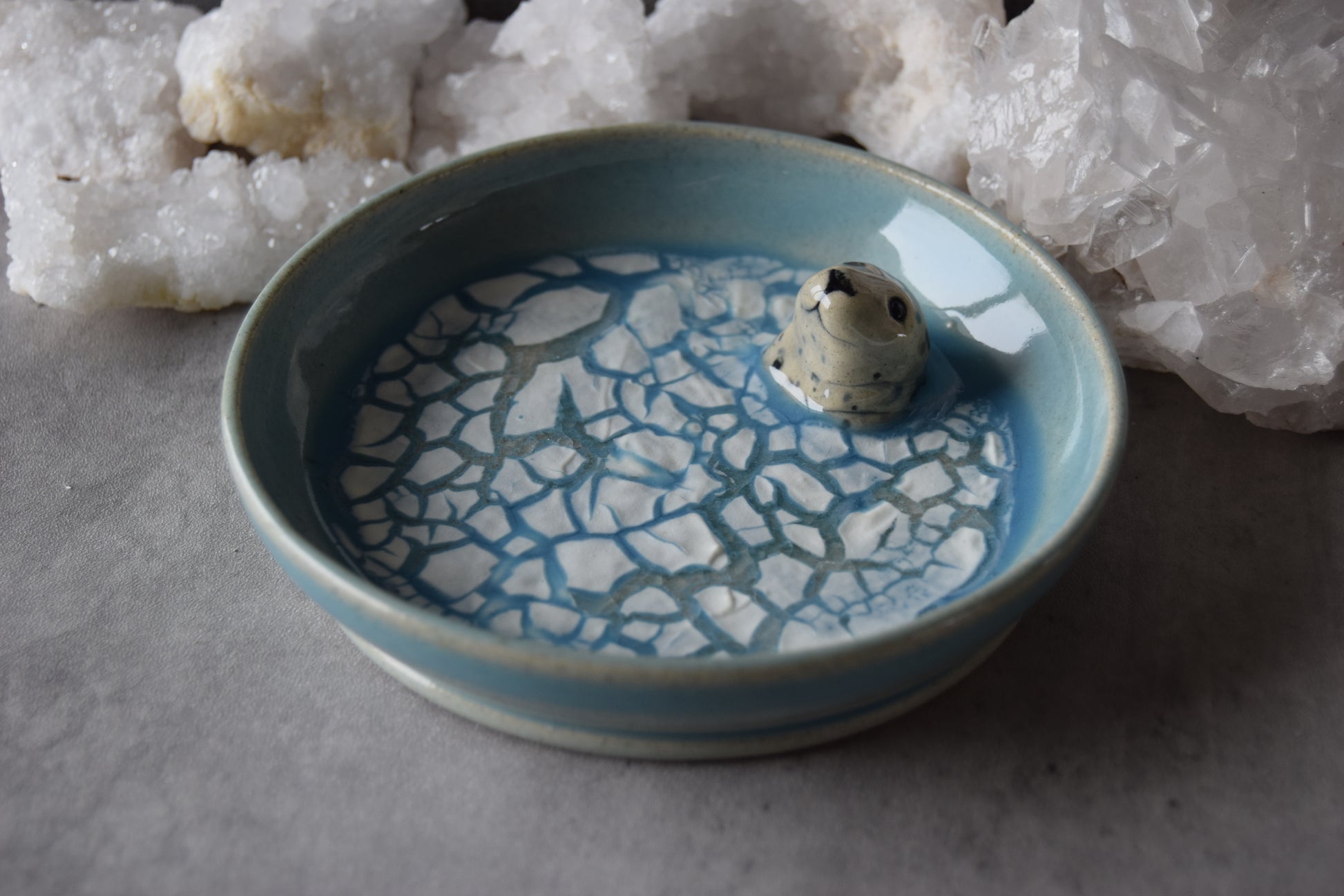 Handmade trinket plate featuring hand sculpted Weddell seal. Plate measures approximately 5" diameter and .75" depth at plate's edge.