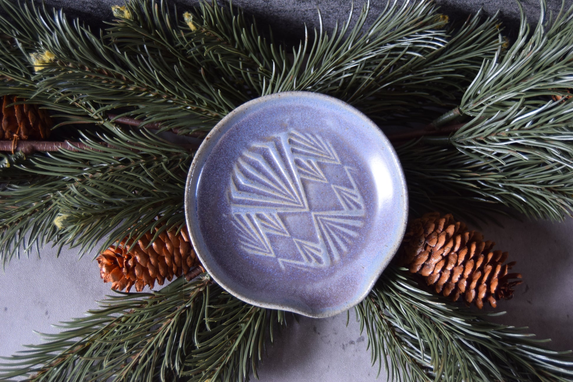 Handmade ceramic spoon rest. Measures approximately 4" diameter and .75" height at the plate's edge.
