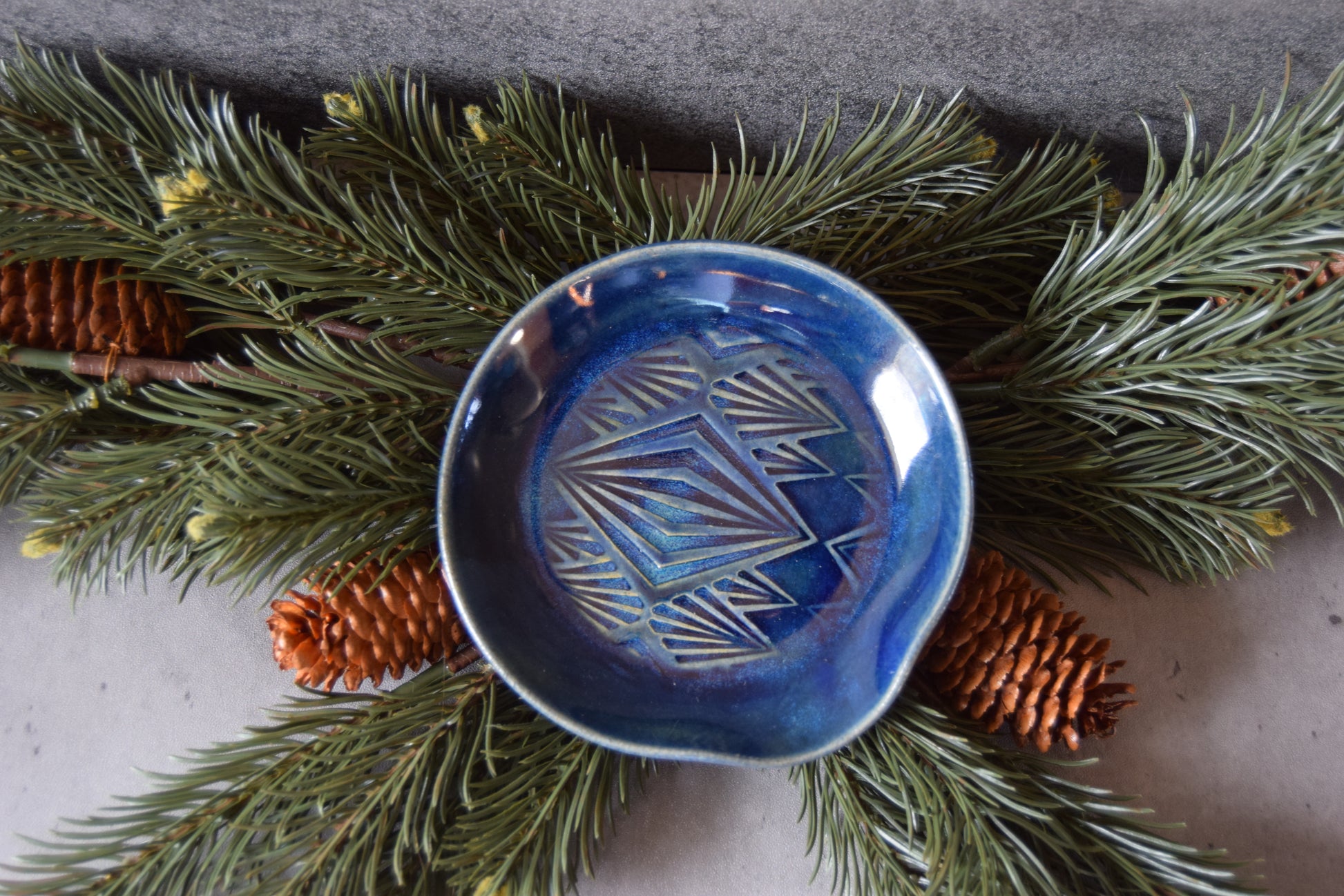Handmade ceramic spoon rest. Measures approximately 4.25" diameter and .75" height at the plate's edge.
