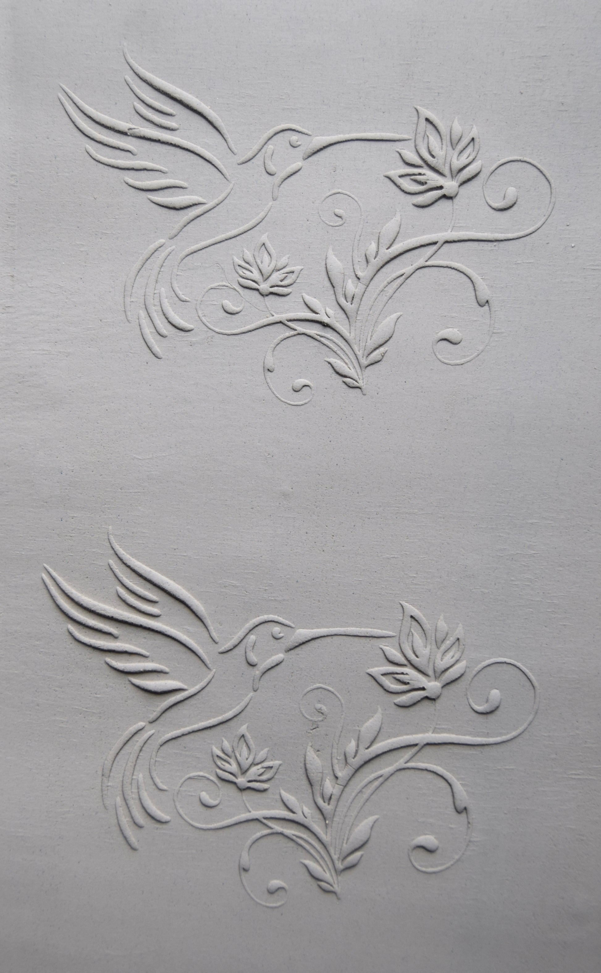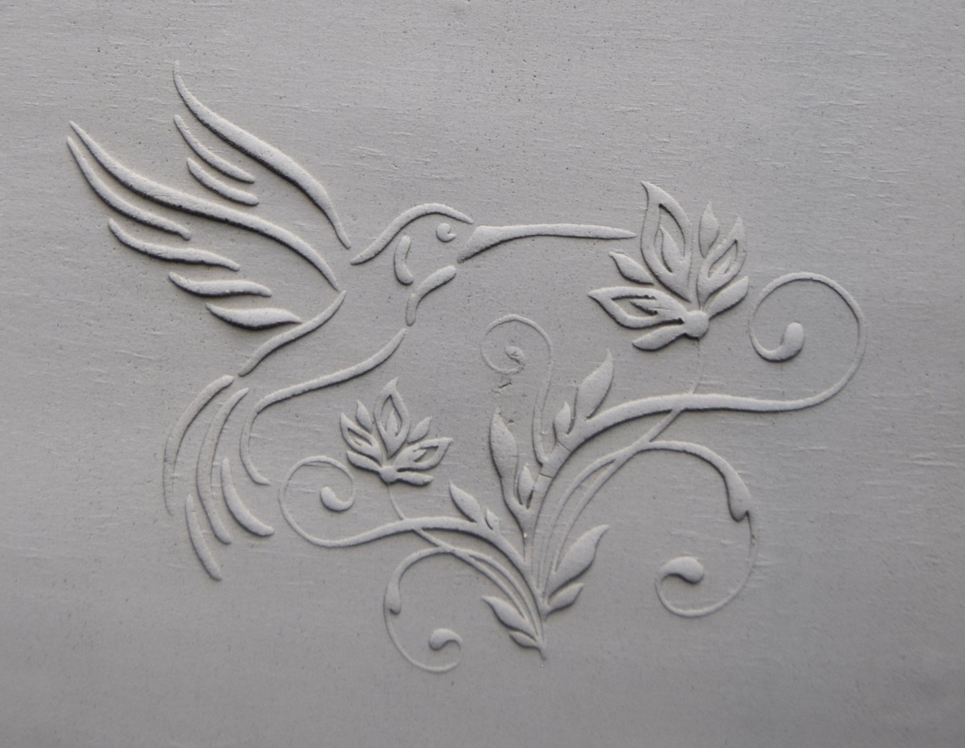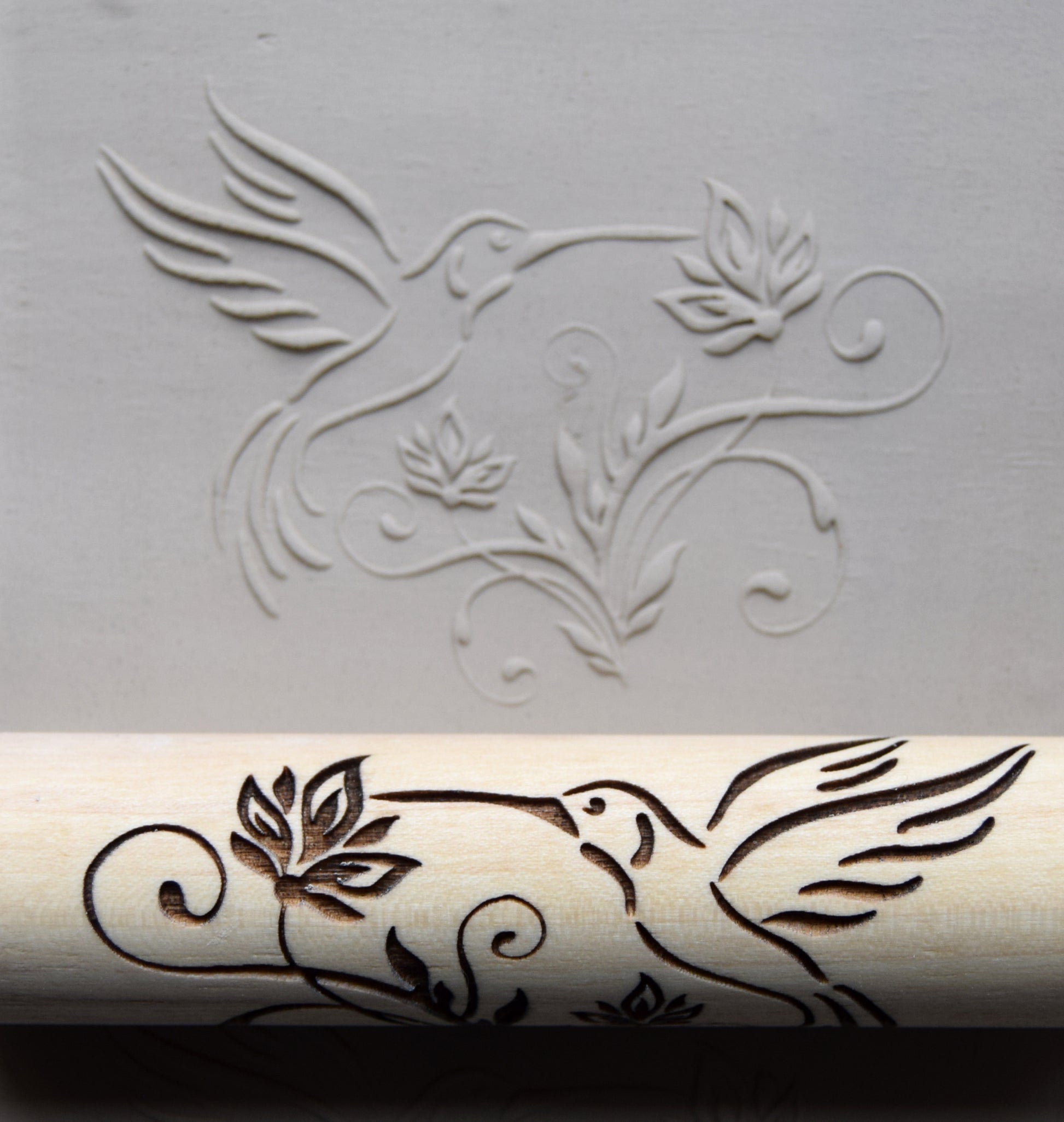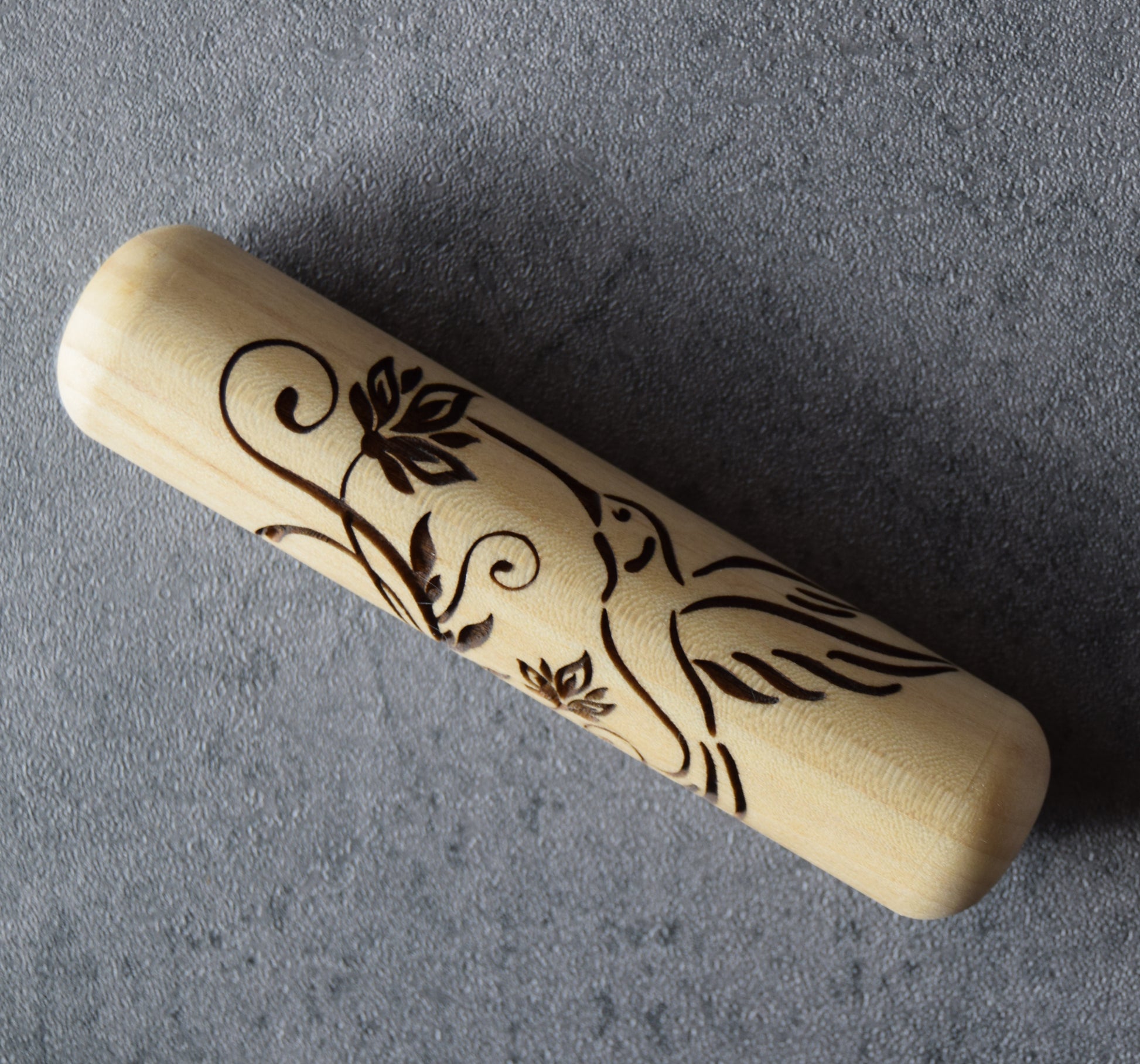 Handmade texture roller featuring laser engraved hummingbird and flowers. Designed for imprinting clay or other similar materials, this roller is made of poplar wood and sealed with protective oil to preserve working quality of the wood. Roller is beveled and sanded smooth on each end for seamlessly integrating with other designs.
