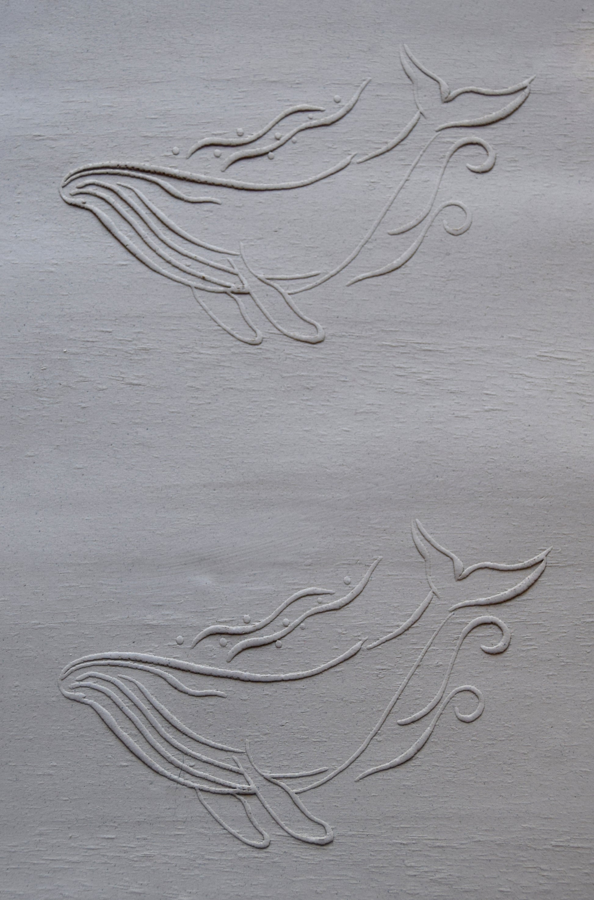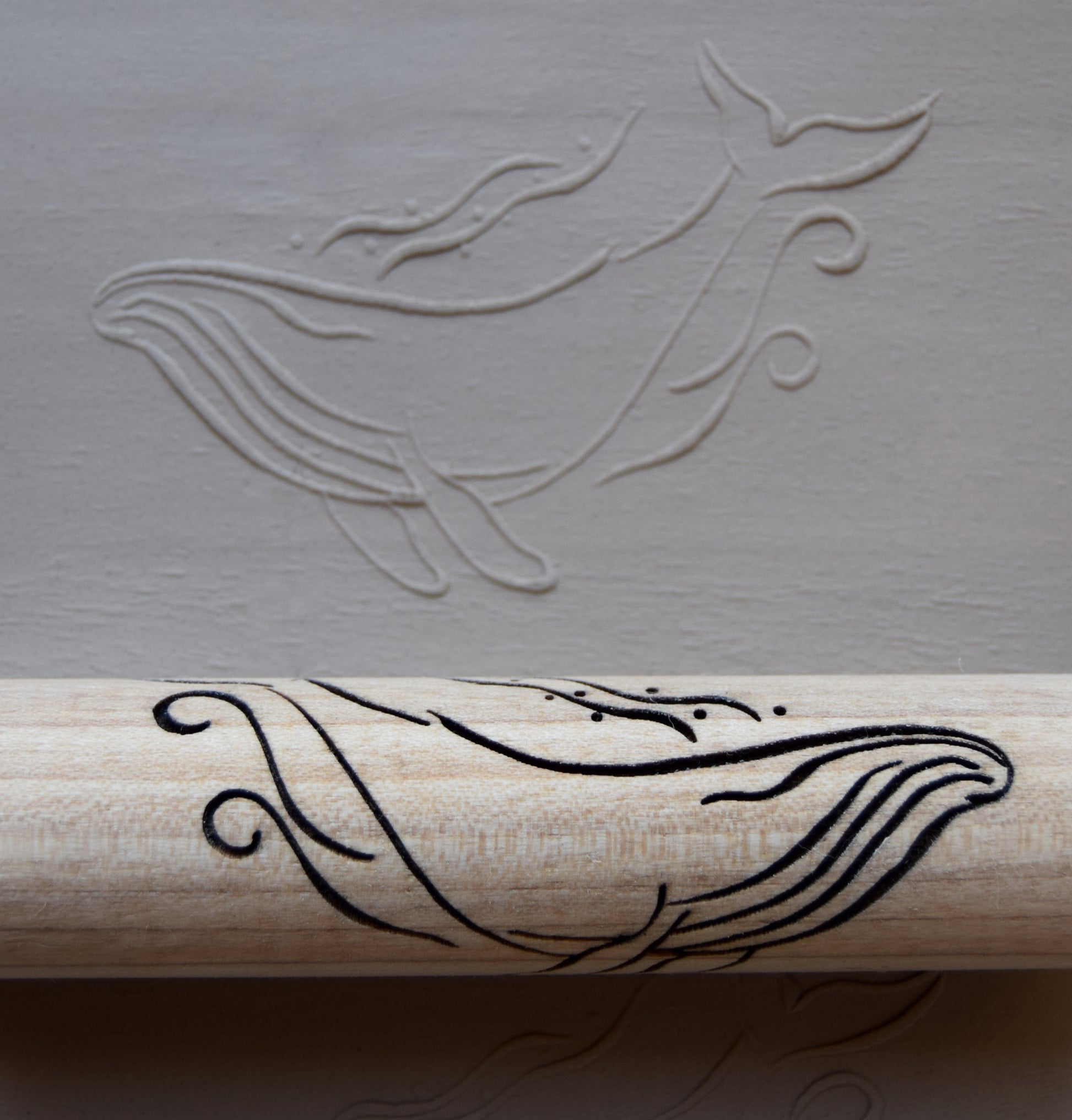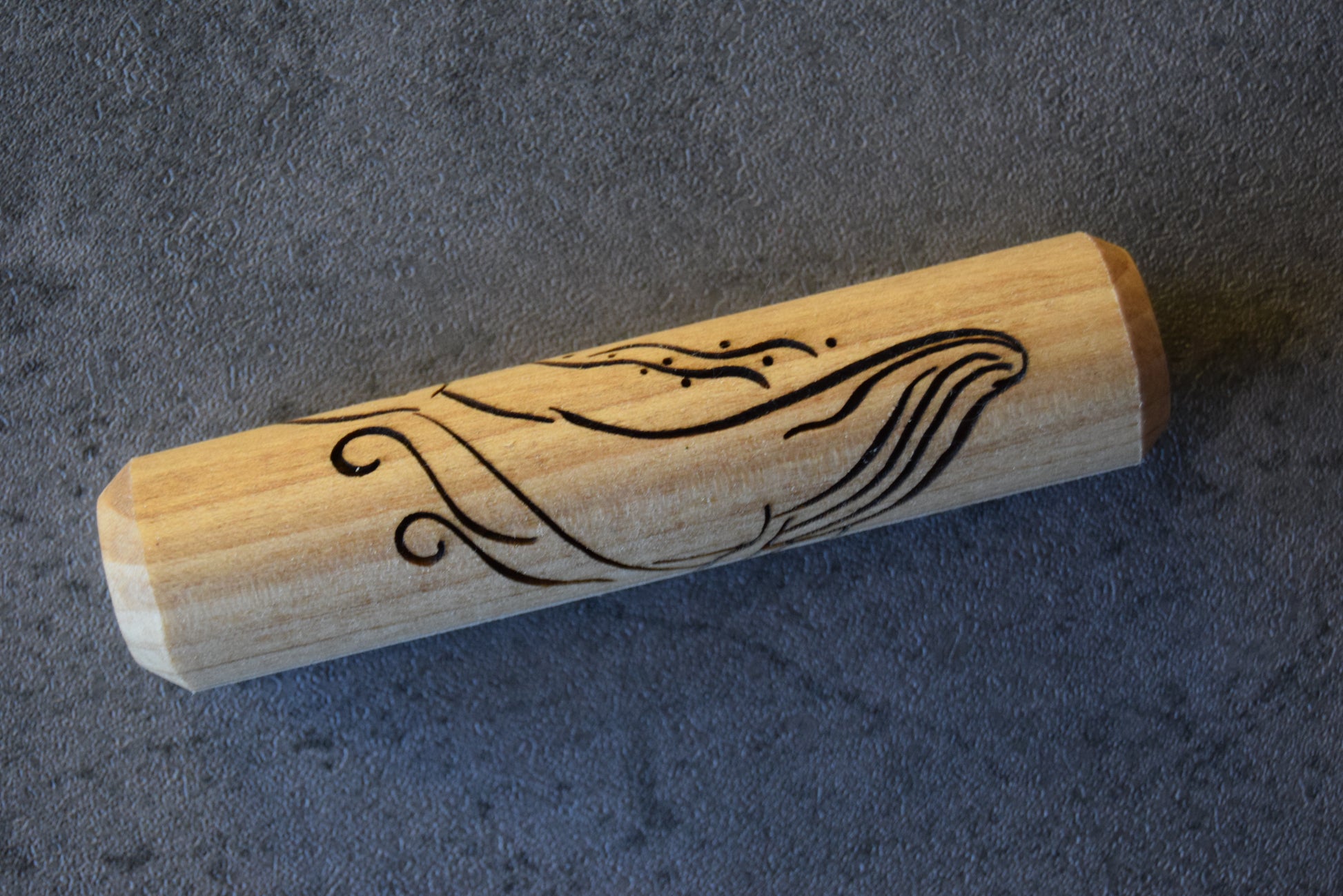 Handmade texture roller featuring laser engraved diving humpback whale pattern. Designed for imprinting clay or other similar materials, this roller is made of poplar wood and sealed with protective oil to preserve working quality of the wood. Roller is beveled and sanded smooth on each end for seamlessly integrating with other designs.