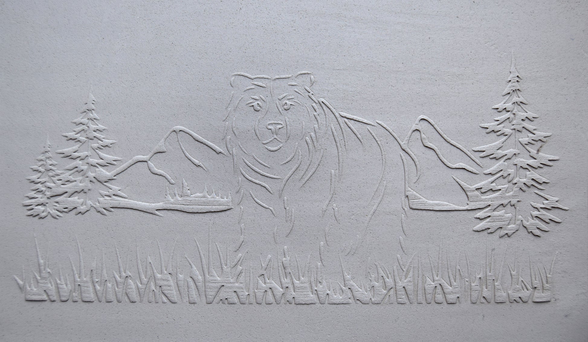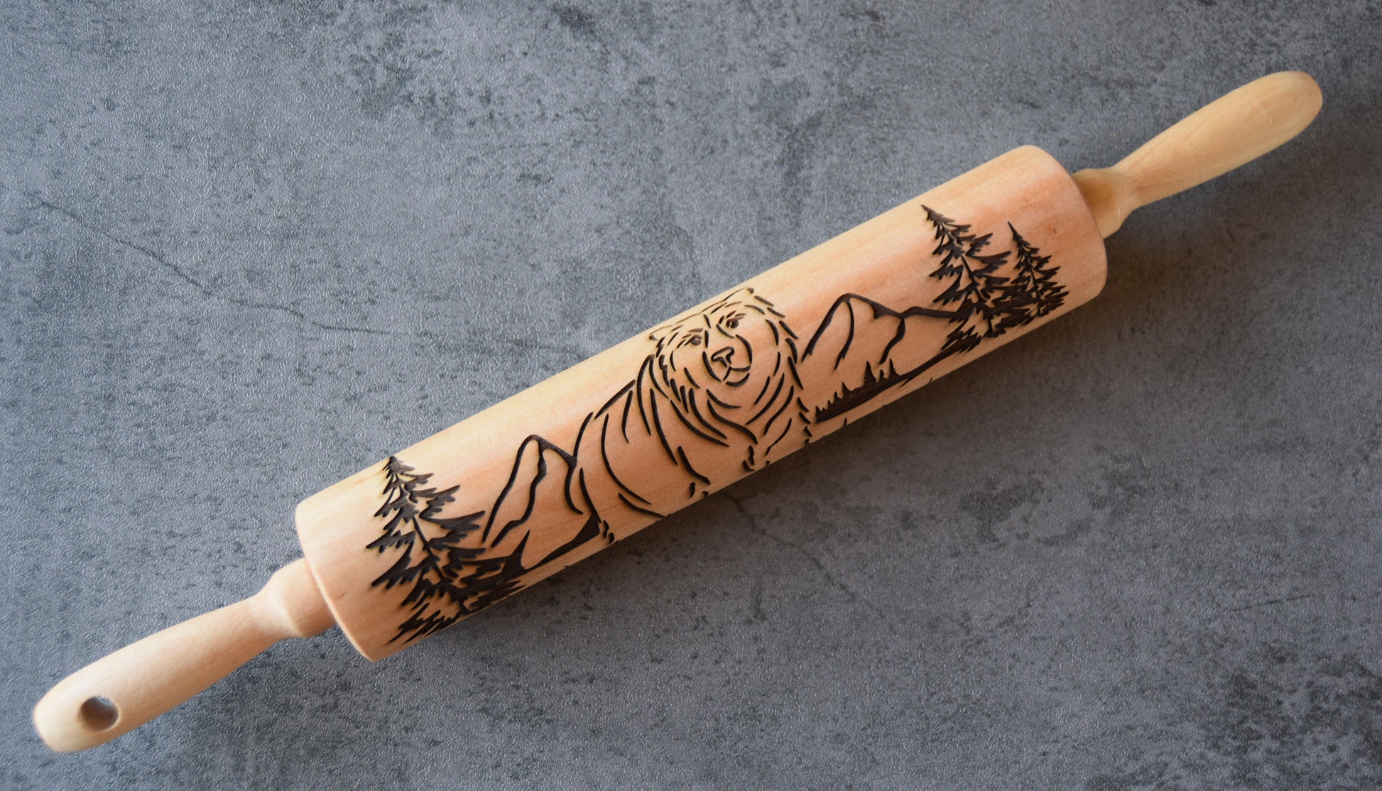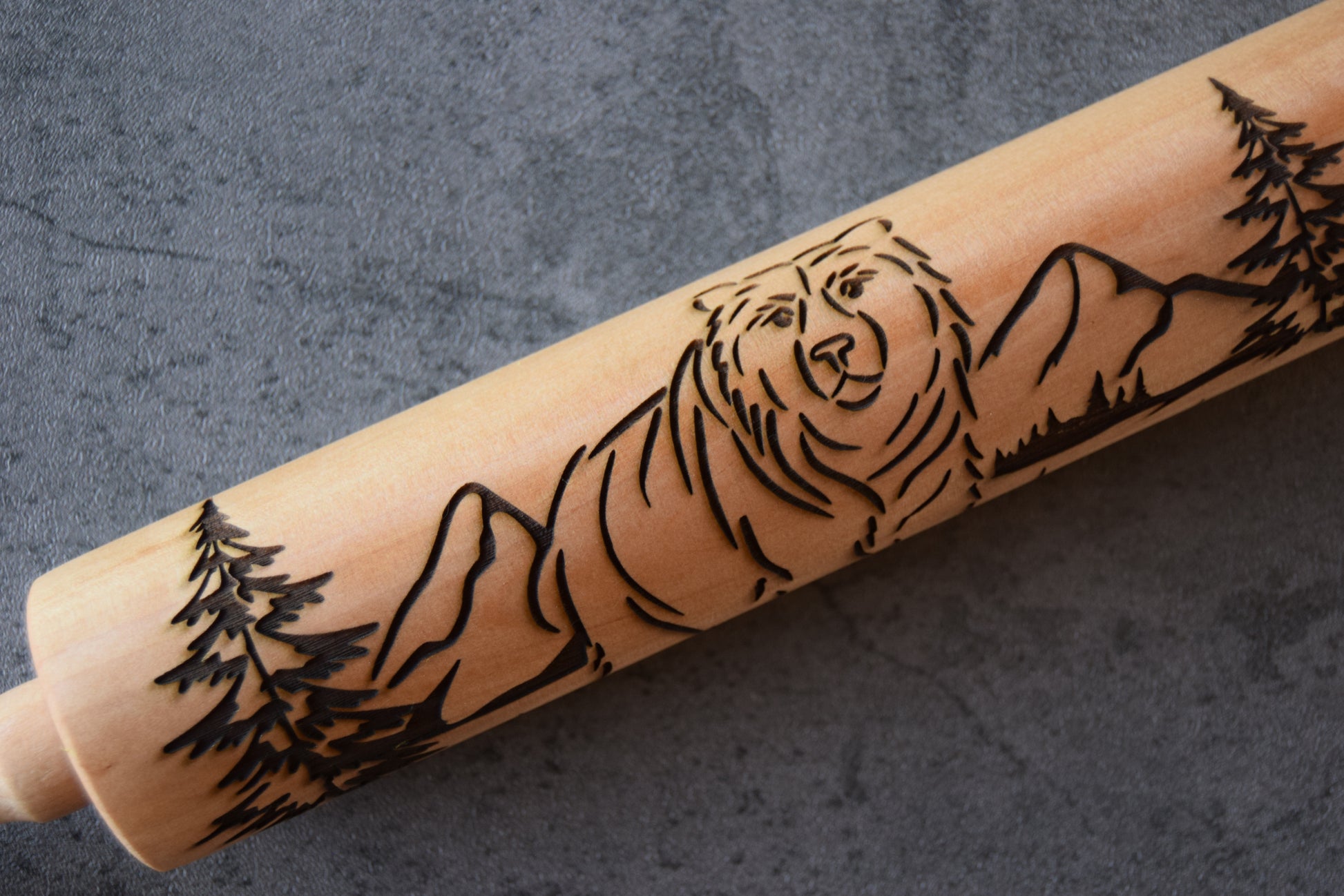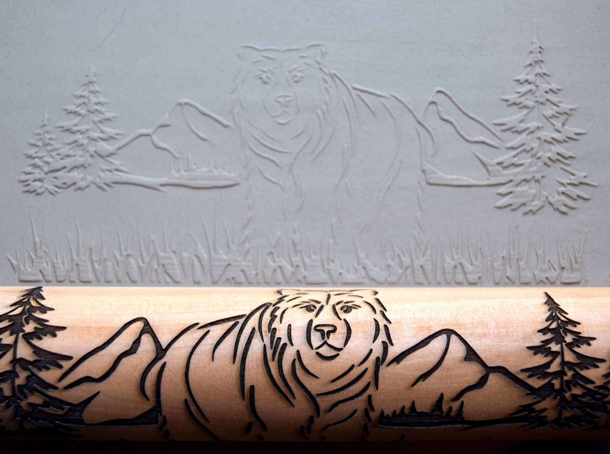 Handmade textured rolling pin featuring laser engraved grizzly bear and mountains pattern. Designed for imprinting clay or other similar materials, this roller is made of rubber wood and sealed with protective oil to preserve working quality of the wood.