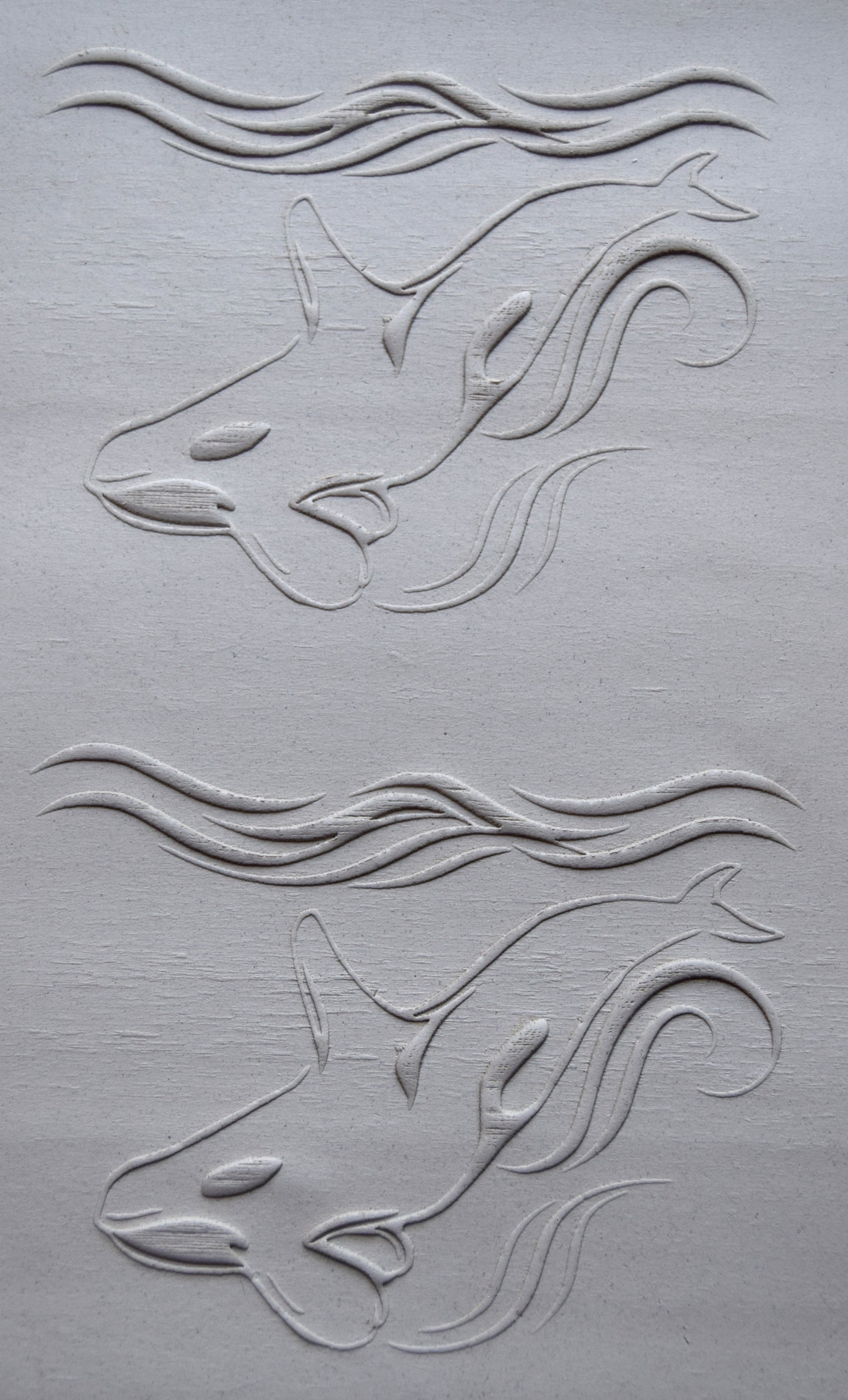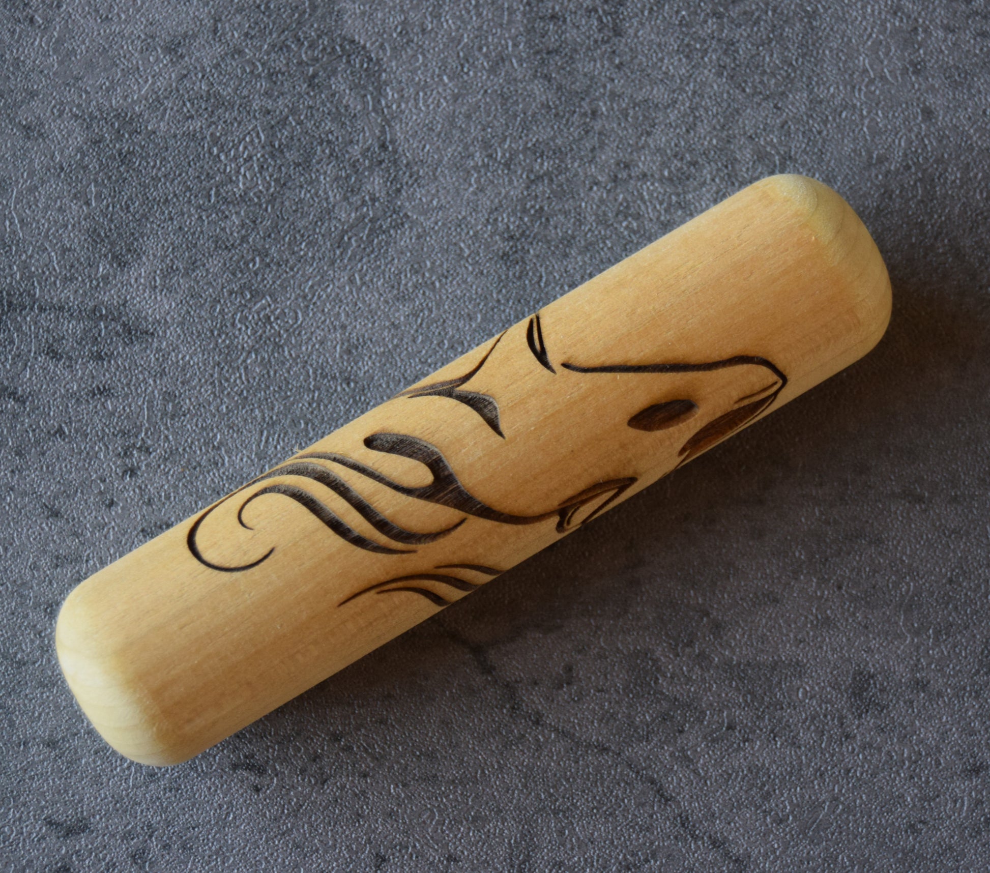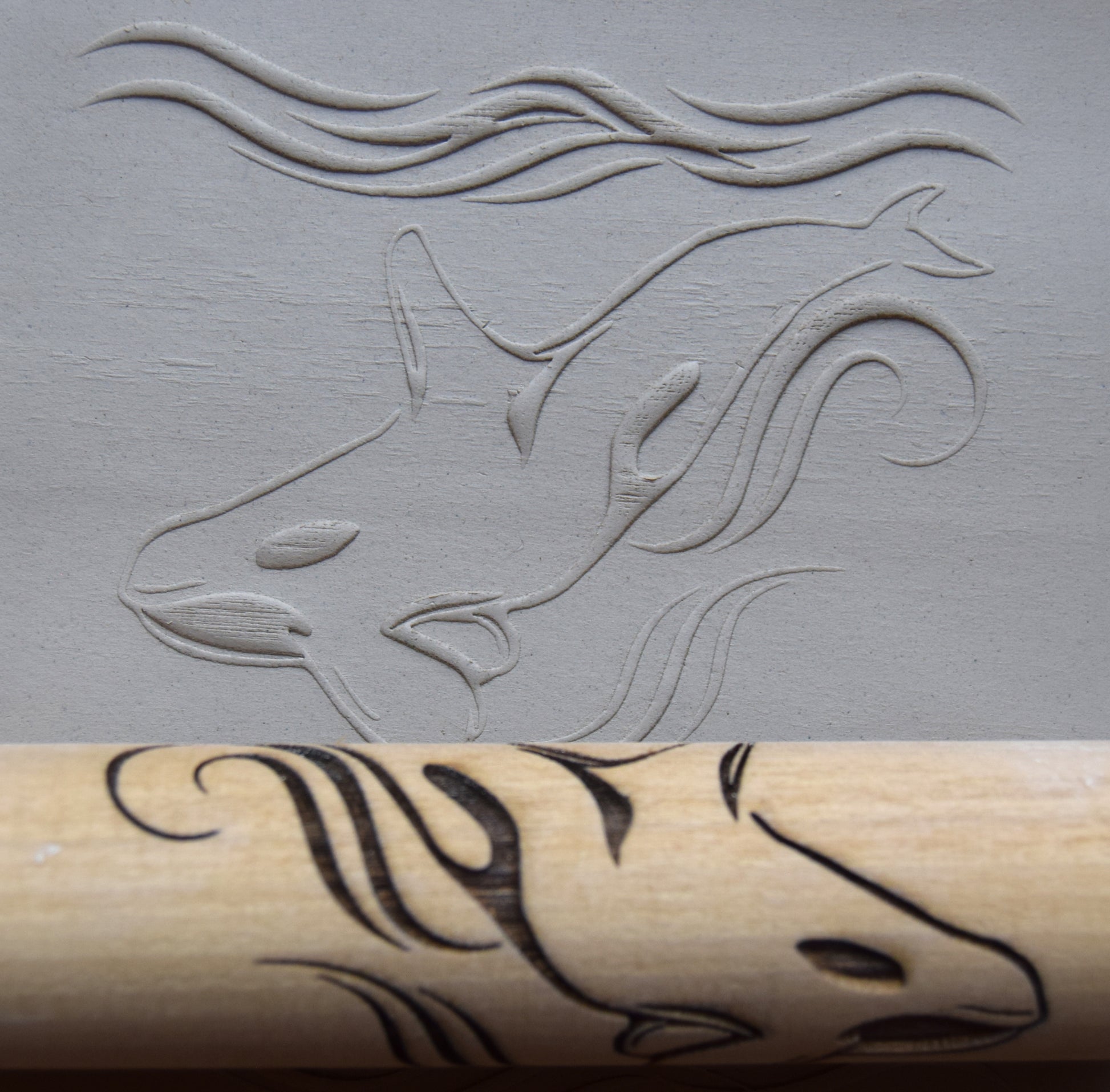 Handmade texture roller featuring laser engraved orca and waves pattern. Designed for imprinting clay or other similar materials, this roller is made of poplar wood and sealed with protective oil to preserve working quality of the wood. Roller is beveled and sanded smooth on each end for seamlessly integrating with other designs.